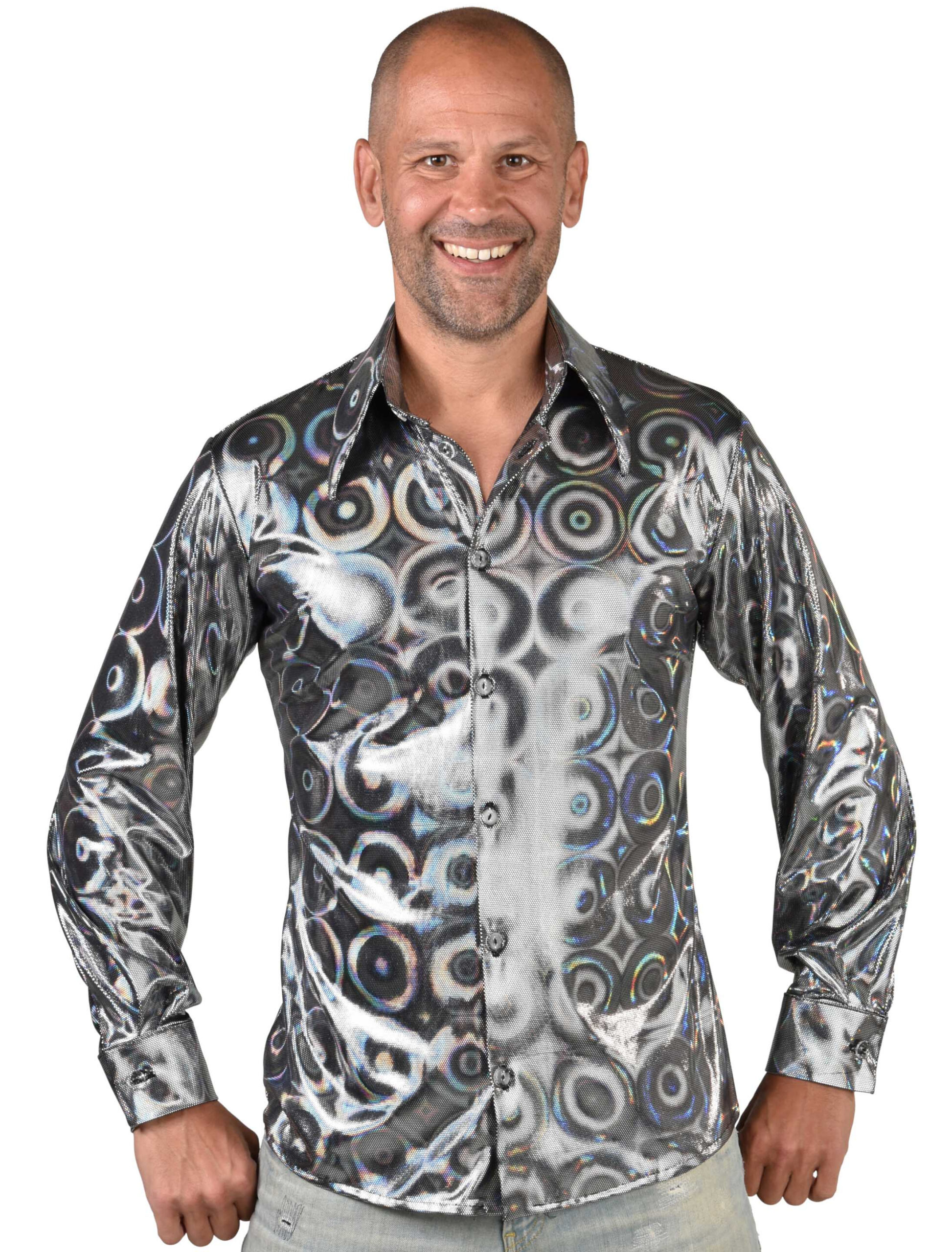Super gestylt für Karneval, 70er Jahre Mottopartys und Disco-Moves bist Du mit diesem silbernen, langärmligen Hologram Herren Hemd Kreise, das durch seine interessante, irisierendes Musterung, die figurnahe Passform mit konventionellem Kragen, praktischer Knopfleiste und geknöpften Manschetten ein bemerkenswerter Hingucker ist. Es ist nicht nur ein attraktives Basic, das Du mit vielen Teilen aus unserem Shop kombinieren kannst, sondern bringt Deine maskuline, sportliche Figur erst so richtig zur Geltung. In ihm bist Du der Disco-König, dem die Damenwelt zu Füßen liegt.