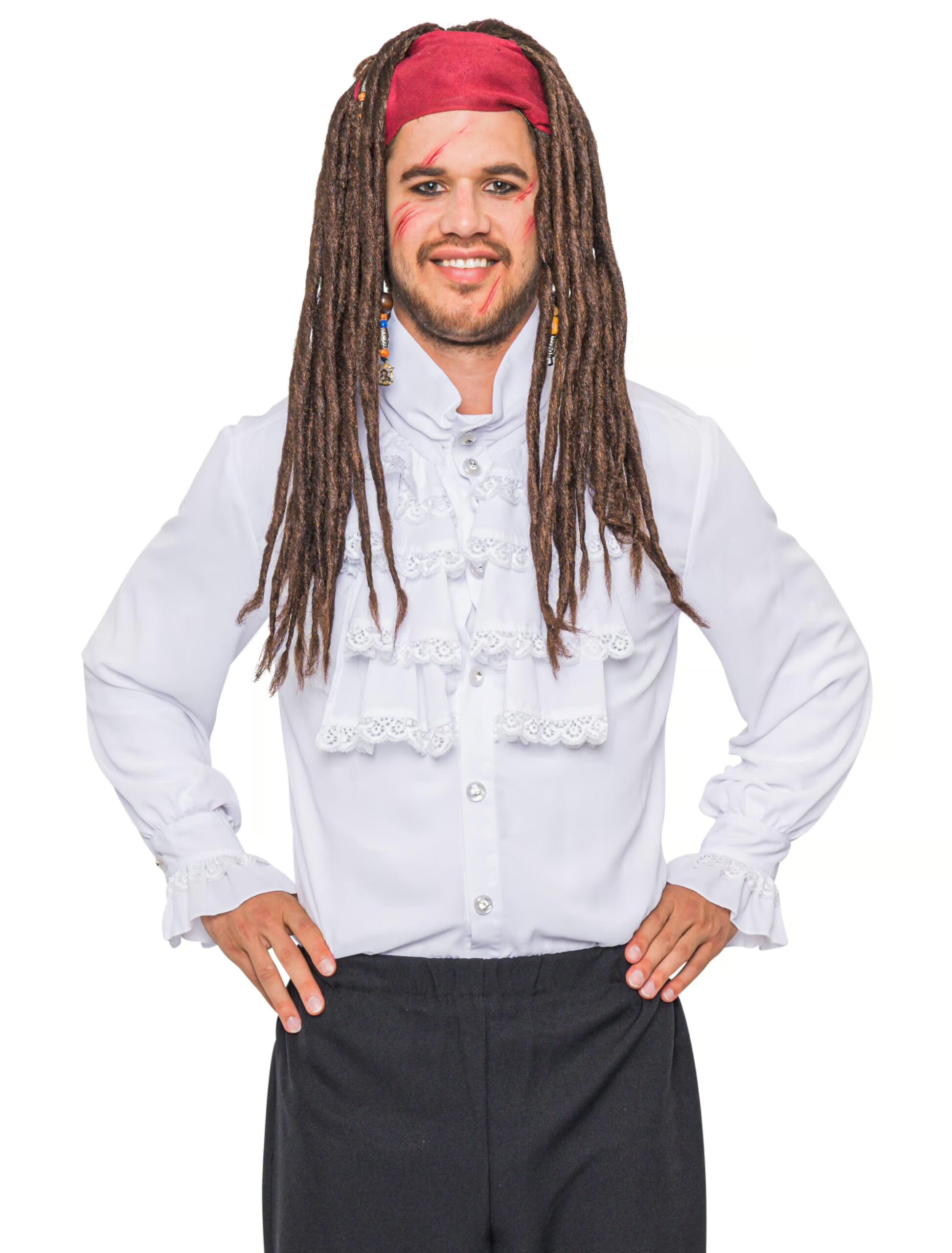Für Piraten und Musketiere unverzichtbar! Das weiße Hemd mit Jabot steht jungen und älteren Herren in fünf Größen zur Verfügung. Vorne ist in dem 100% Polyesterstoff eine Knopfleiste eingearbeitet. Die langen Ärmel mit Rüschen- und Spitzenverzierung werden mit Knöpfen geschlossen. Von dem breit geschnittenen Kragen fällt auf der Vorderseite ein zweigeteilter Jabot aus Rüschenspitzen bis über die Hemdmitte herunter. Trage dieses lässige Spitzenhemd zusammen mit einer Kapitänsjacke aus unseren Piratenartikeln.