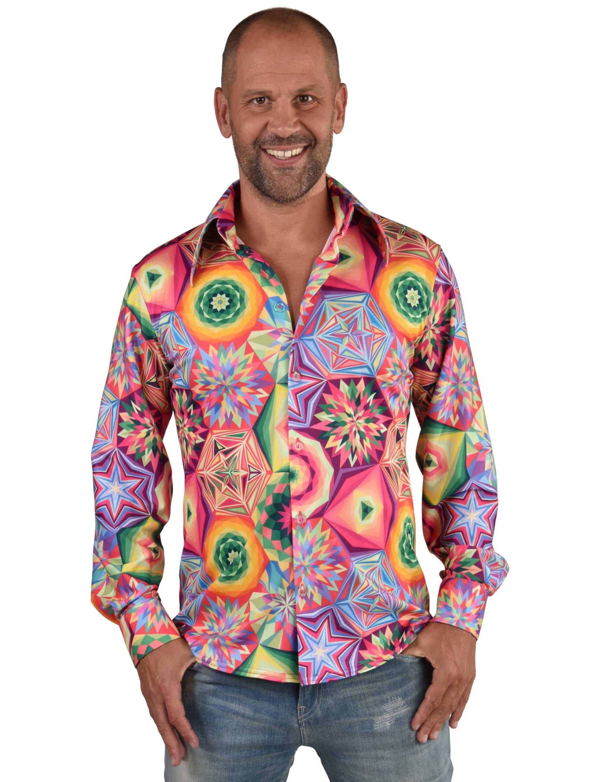 Ein echter Blickfang ist dieses bunte Party Hemd im 70er Jahre Look für den jungen und jung gebliebenen Herrn, mit dem Du auf nostalgischen Retro- und turbulenten Karnevalspartys sofort auffällst. Das aparte Hemd mit der knallbunten, kaleidoskopischen Musterung, den langen Ärmeln, dem konventionellen Kragen sowie der praktischen Knopfleiste ist figurnah geschnitten und bringt Deine Figur schön zur Geltung. Ein super Basic, das Du gut mit vielen Teilen aus unserem Shop für unvergessliche Auftritte toll kombinieren kannst.