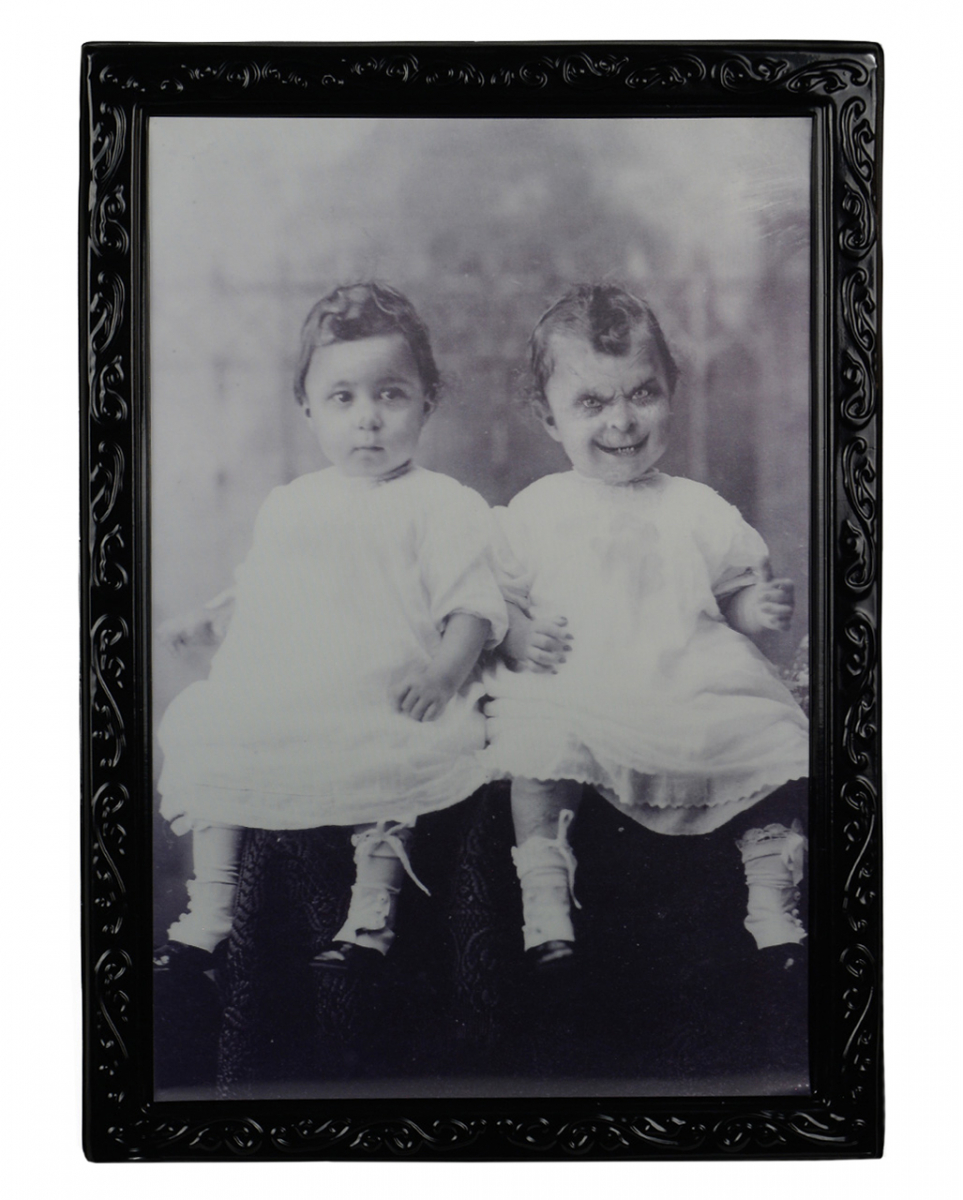 Hologramm Effektbild Zombie Zwillinge als Halloween Deko Gespenstisches Wandbild im Antik-Look für Halloween-Partys Verwandle dein Heim in eine Geisterbahn mit unserem Hologramm Effektbild Zombie Zwillinge als Halloween Deko! Das gruselige Wackelbild wird an Halloween und auf Horrorpartys unter Garantie für Herzrasen unter deinen Partygästen sorgen! Das Hologramm Effektbild Zombie Zwillinge als Halloween Deko besticht durch seine geniale Optik. Im Stil einer alten, schwarz-weißen Fotografie gehalten, zeigt die Halloween-Deko zwei scheinbar süße Zwillinge, je nach Position des Betrachters wandelt sich das Bild jedoch und präsentiert zwei fies grinsende Zombie-Fratzen. Verschnörkelte Ornamente am Rahmen der Grusel-Dekoration lassen das Wackelbild zusätzlich besonders realistisch wirken. Lieferumfang: 1 x Hologramm Effektbild Zombie Zwillinge als Halloween Deko Farbe: Schwarz/Grau/Weiß Größe: ca. 25 x 39 cm Material: Kunststoff