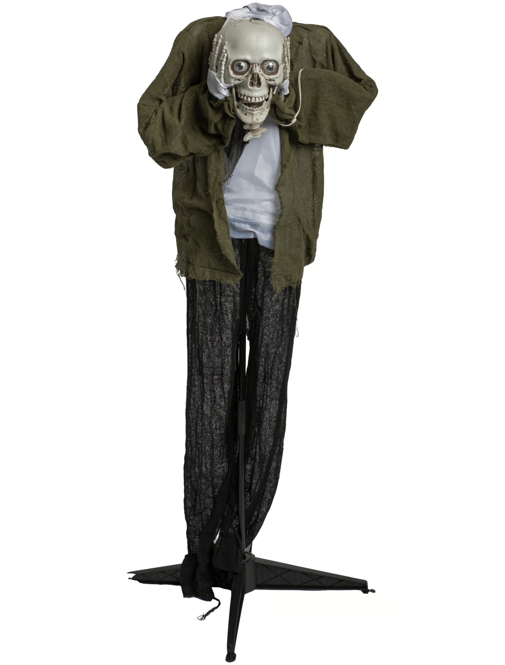 Die Standpuppe ist die neue Idee für Deine Halloween Dekoration. Obwohl der Schädel nicht mehr auf den Schultern sitzt, lässt er Hohn und Spott auf Dich regnen. Auf Knopfdruck erklingt eine von drei englischsprachigen Verwünschungen, effektvoll unterstützt durch passende Kieferbewegungen und aufleuchtende Augen.