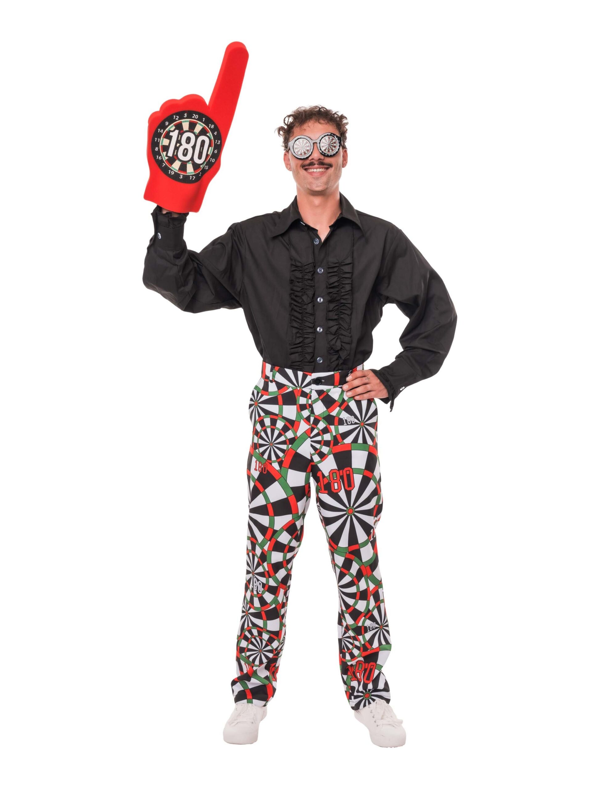 Unsere Hose Darts ist der perfekte Volltreffer für alle, die Spaß und Stil verbinden wollen. Die Hose lässt sich vorne bequem mit einem Knopf und einem Reißverschluss schließen und ist mit Gürtelschlaufen sowie zwei praktischen Taschen ausgestattet. Das Highlight ist das auffällige Muster: Überall sind Dartscheiben zu sehen, zwischen denen die legendäre Zahl 180 in verschiedenen Größen und Farben hervorsticht. Ob Karneval, Motto-Party oder einfach als witziges Statement – mit unserer Darts Hose bist du immer im Spiel!