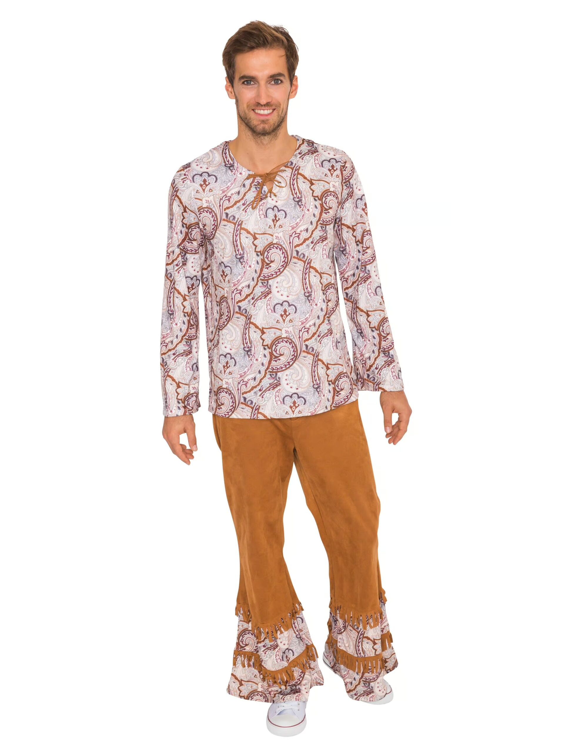 Coole Herren Hose im angesagten Hippie-Style der späten 60er und frühen 70er! Die Hose besteht aus einem braunen Stoff, der am Schlag jeweils mit Fransen und (Blüten-)Mustern verziert ist. Am Bund ist auf der Rückseite ein Gummizug eingearbeitet, der die Hose sehr bequem macht. Besonders praktisch ist die Gesäßtasche mit Reißverschluss. In der Front wird die Hose mit einem Hosenknopf sowie einem Reißverschluss verschlossen. Die kunterbunte Zeitreise kann beginnen!