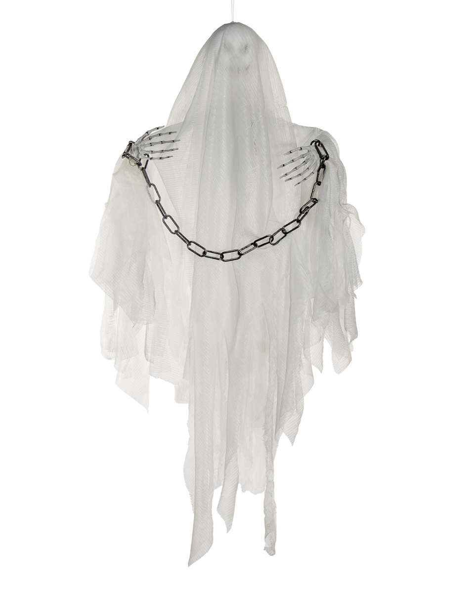 Gefesseltes Fetzengespenst mit Bewegung, Licht und Sound 85 cm Geist als Halloween Hängedekoration mit Beleuchtung Unser gefesseltes Fetzengespenst mit Bewegung, Licht und Sound murmelt unheimlich vor sich hin, während es dazu unheimlich leuchtet und wild mit den Armen zappelt. Die perfekte Deko für Haunted House und Halloween Partys! Unser gefesseltes Fetzengespenst mit Bewegung, Licht und Sound ist ca. 85 x 30 x 20 cm groß. Um es zu aktivieren, benötigst du 3 AAA-Batterien (nicht inklusive). Verwandle dein Zuhause in eine Geisterbahn! Lieferumfang: 1 x Gefesseltes Fetzengespenst mit Bewegung, Licht und Sound 85cm Farbe: Weiß, Schwarz Größe: ca. 85 x 30 x 20 cm Batterien: Es werden 3 x AAA-Batterien benötigt, nicht inkl. Material: Kunststoff, Polyester, Draht Halloween Geist zum Hängen Soundaktivierte Gespenster Dekoration Gespenst schüttelt die Arme, leuchtet und spricht verschiedene Phrasen (engl.) Unheimliche Halloween Hängefigur Geisterhaus Effekt