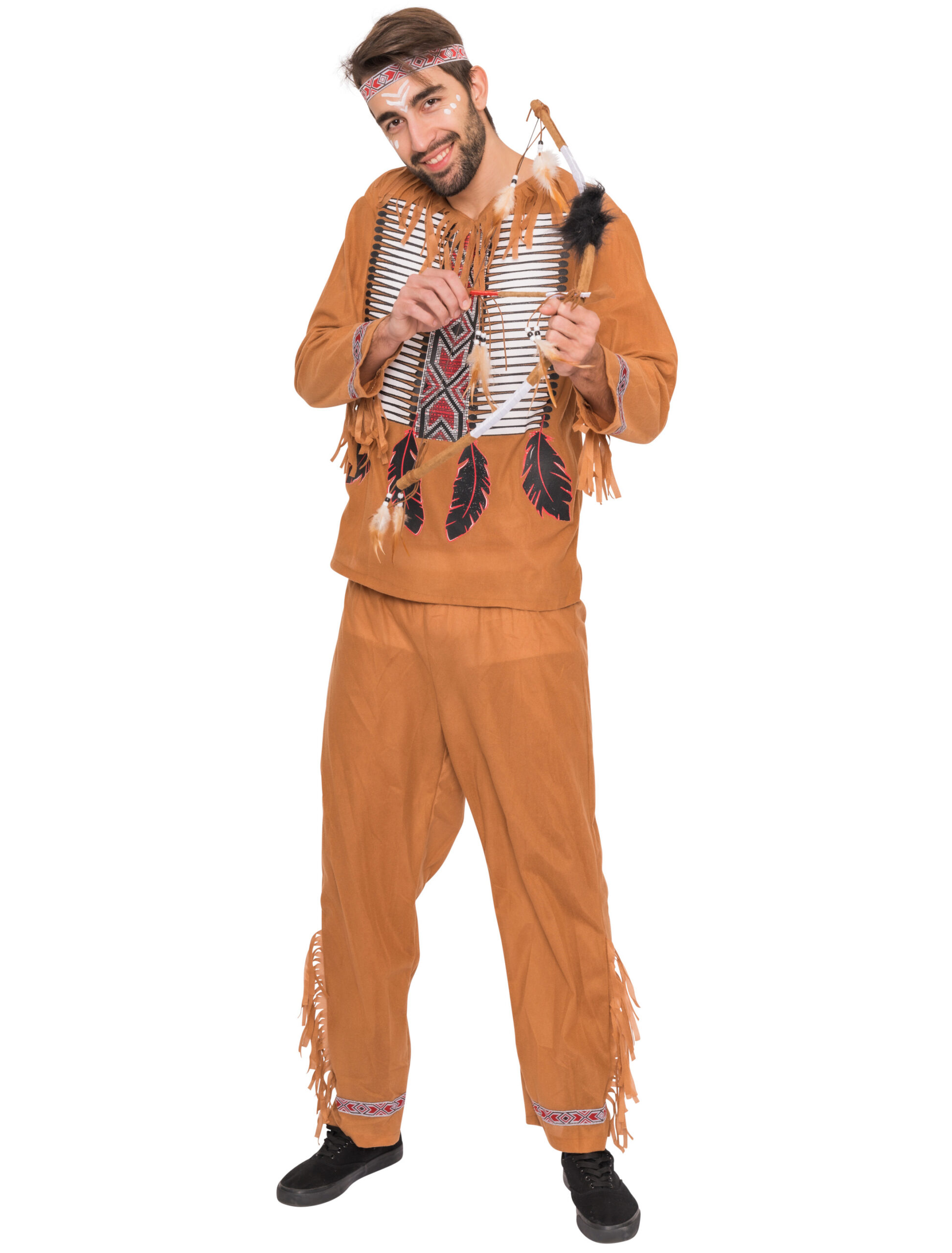 Mit diesem großartigen Kostüm verwandelst Du Dich in einen richtigen Indianer aus dem Wilden Westen Amerikas. Das bräunliche Kostüm besteht aus einer langen Hose, einem langärmligen Oberteil und einem verzierten Stirnband mit angedeuteten Stickereien. Das dreiteilige Set hat mehrere Fransen an den Hosenbeinen, am Kragen und an den Ärmeln. Die zusätzlichen Stickereien, lassen das Outfit auch richtig echt aussehen. Da dürfen auch die aufgedruckten Federn auf dem Oberteil nicht fehlen. Thematisch passende Artikel wie den Bogen, Federschmuck oder Schminke findest Du hier im Shop.