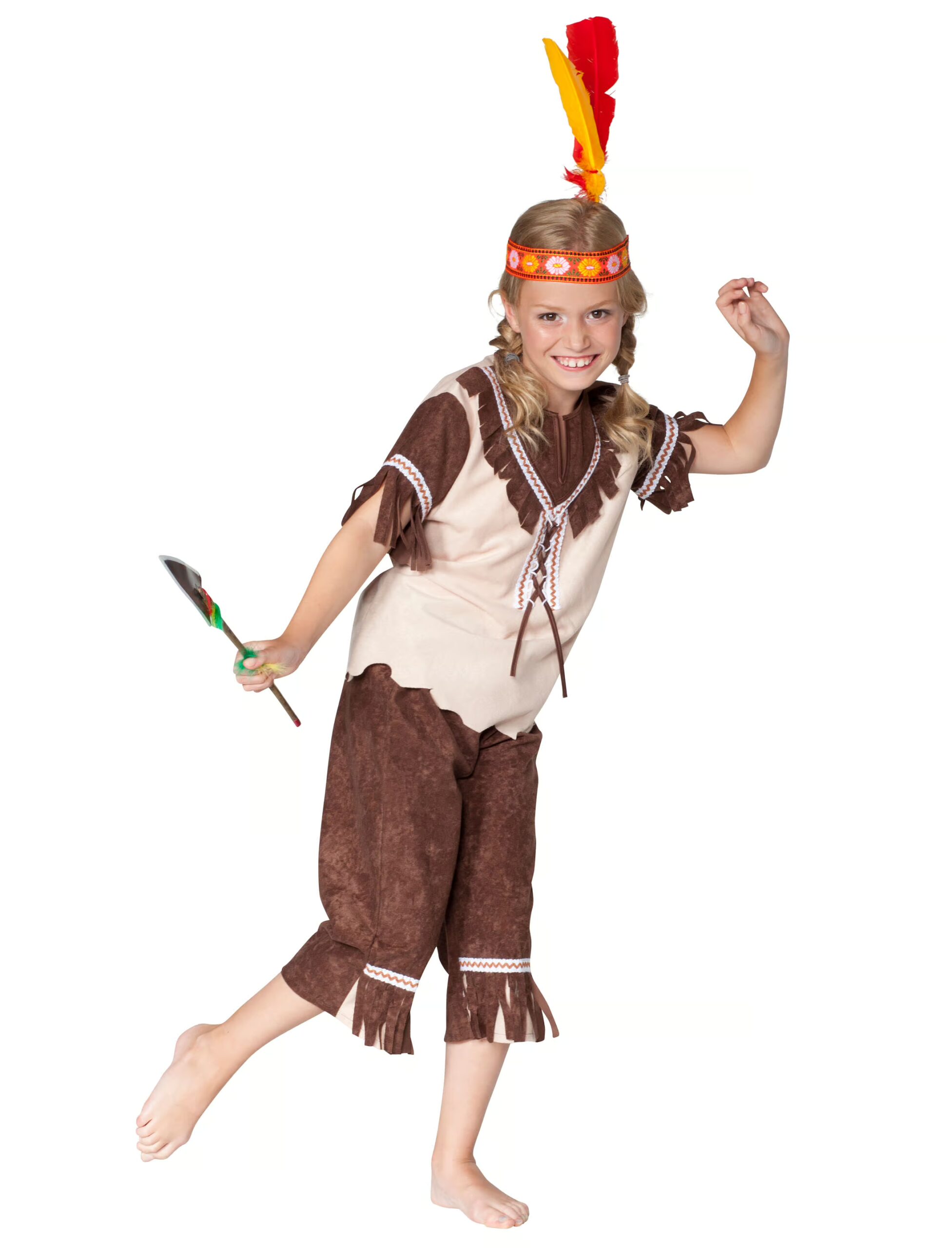 Als Indianerin musst Du auf leisen Sohlen unterwegs sein, um Dich an Cowboys heranzuschleichen – mit diesem Indianerinnen Kostüm stellst Du garantiert jeden Cowboy an den Marterpfahl und zeigst ihnen wo es lang geht! Das zweiteilige Kostüm besteht aus einer schicken Fransenhose und einem passenden Oberteil. Die Hose reicht bis zu den Knien und wurde mit einem Gummizug versehen. Sie ist aus dunkelbraunem Stoff in Velours-Optik gefertigt und an den Knien mit Borten im Indianer-Stil und Fransen versehen. Das Oberteil ist in hellbraunem Velours-Stoff gehalten. Die Säume sind unregelmäßig geschnitten und die Ärmel und der Ausschnitt sind ebenfalls mit Fransen besetzt. Im Brustbereich wird das Oberteil geschnürt und ist entlang des Ausschnitts sowie der Oberarme mit passenden Borten verziert. Im Lendenbereich befindet sich ein praktischer Gummizug, der das Kostüm tailliert. Mit etwas Federschmuck und der passenden Kriegsbemalung bist Du bereit mit Deinem Indianerstamm die nächste Kostümparty