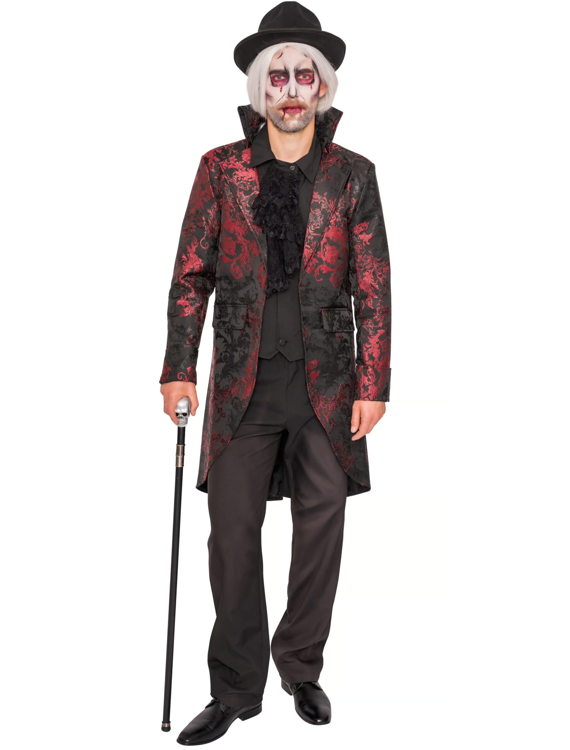 Du bist auf der Suche nach dem perfekten Edel-Look für die nächste Kostümparty? Kombiniere unsere rot-schwarze Jacke in Brokat-Optik zur schwarzen Hose und schwarzen Volant-Hemd und Du bist der Mann, nach dem sich die Damen sicherlich mehr als einmal umdrehen. Die Jacke aus Polyester mit angenähter Weste wird mit Knöpfen verschlossen. Zwei Fronttaschen sind ein weiteres, schickes Detail. Den letzten Schliff bekommt Dein Edel-Outfit mit dem bei uns separat erhältlichen Totenkopf-Spazierstock.