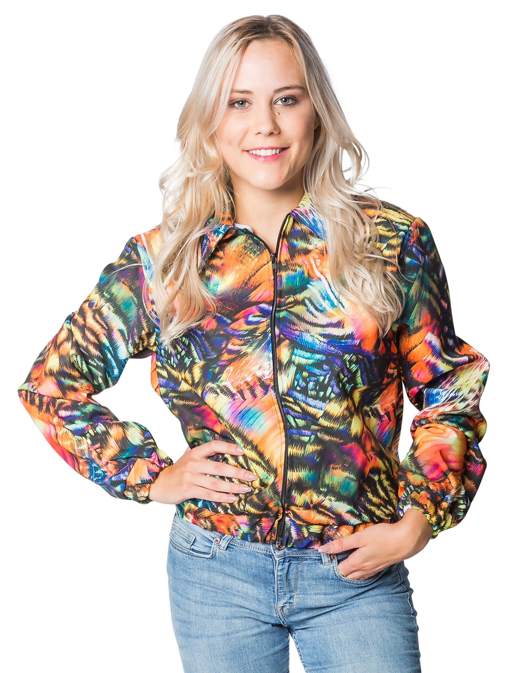 Genau die richtige Ergänzung zu Deinem Flower-Power-, Hippie oder Schlager Party-Outfit! Unsere kurze Damen Jacke im bunten Schmetterlings-Muster darf hier nicht fehlen. Die Jacke wird mit einem Reißverschluss in der Front verschlossen. Eine schöne Jacke für Karneval, Fasching und die nächste Mottoparty. Die Jacke ist aus 100% Polyester gefertigt. Exklusiv Artikel.