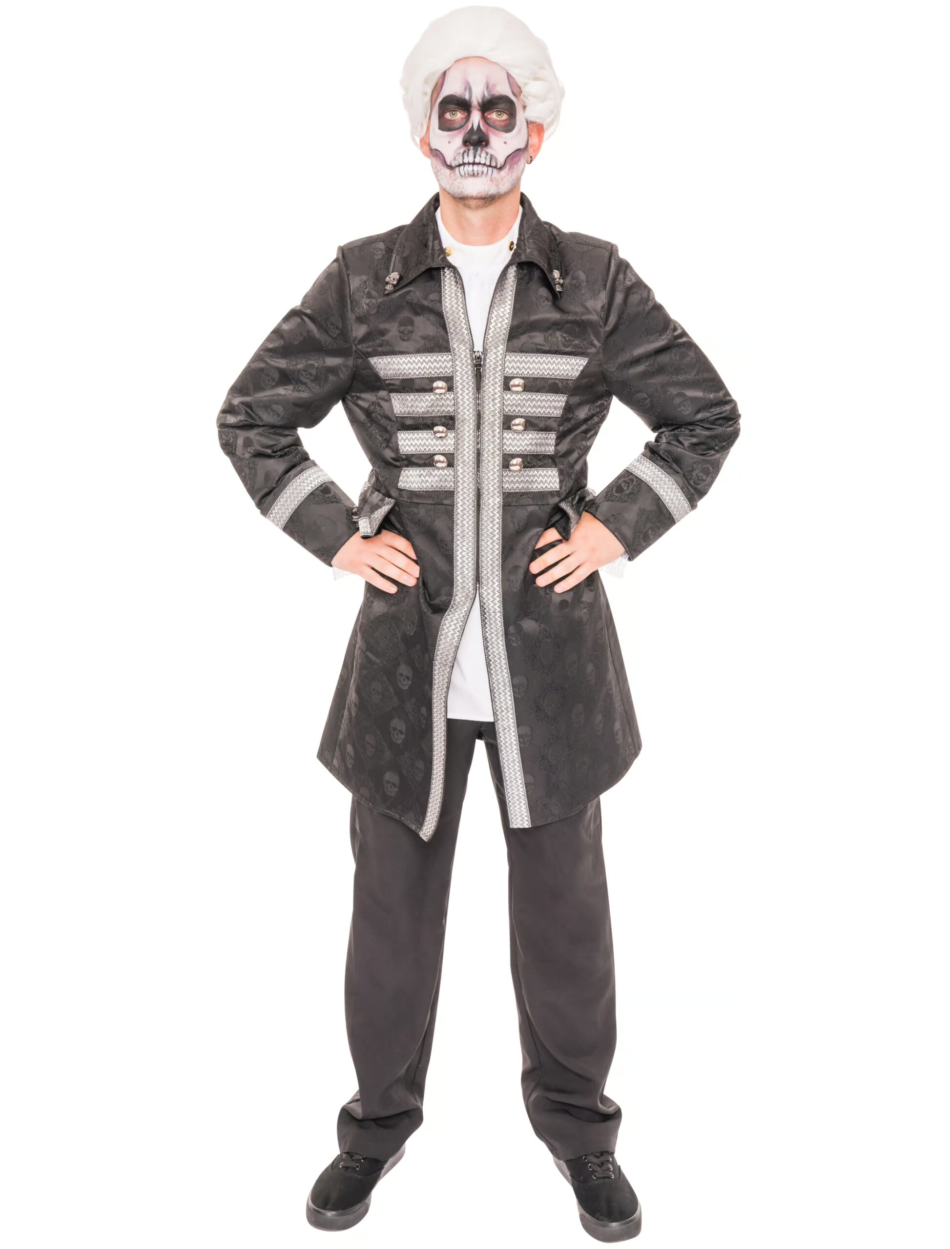 Halloween mit Stil! Das gelingt Dir mit dieser edlen Herren Jacke garantiert. Das schaurig-schöne Kleidungsstück besteht aus einem schwarzen Stoff, der rundum mit gruseligen Totenköpfen verziert ist. Die Ärmelsäume, die Taschenklappen und die Front der länger geschnittenen Jacke sind mit dekorativen Borten in Silber geschmückt. Die Totenkopf-Knöpfe am Kragen und an den angedeuteten seitlichen Taschen sowie die silberfarbenen Knöpfe in der Front runden das Halloween Kostüm gekonnt ab. Du kannst die Totenkopf-Jacke entweder lässig offen tragen oder mit Hilfe des Reißverschlusses schließen. Dazu passen düstere Accessoires und gruselige Gesichtsschminke.