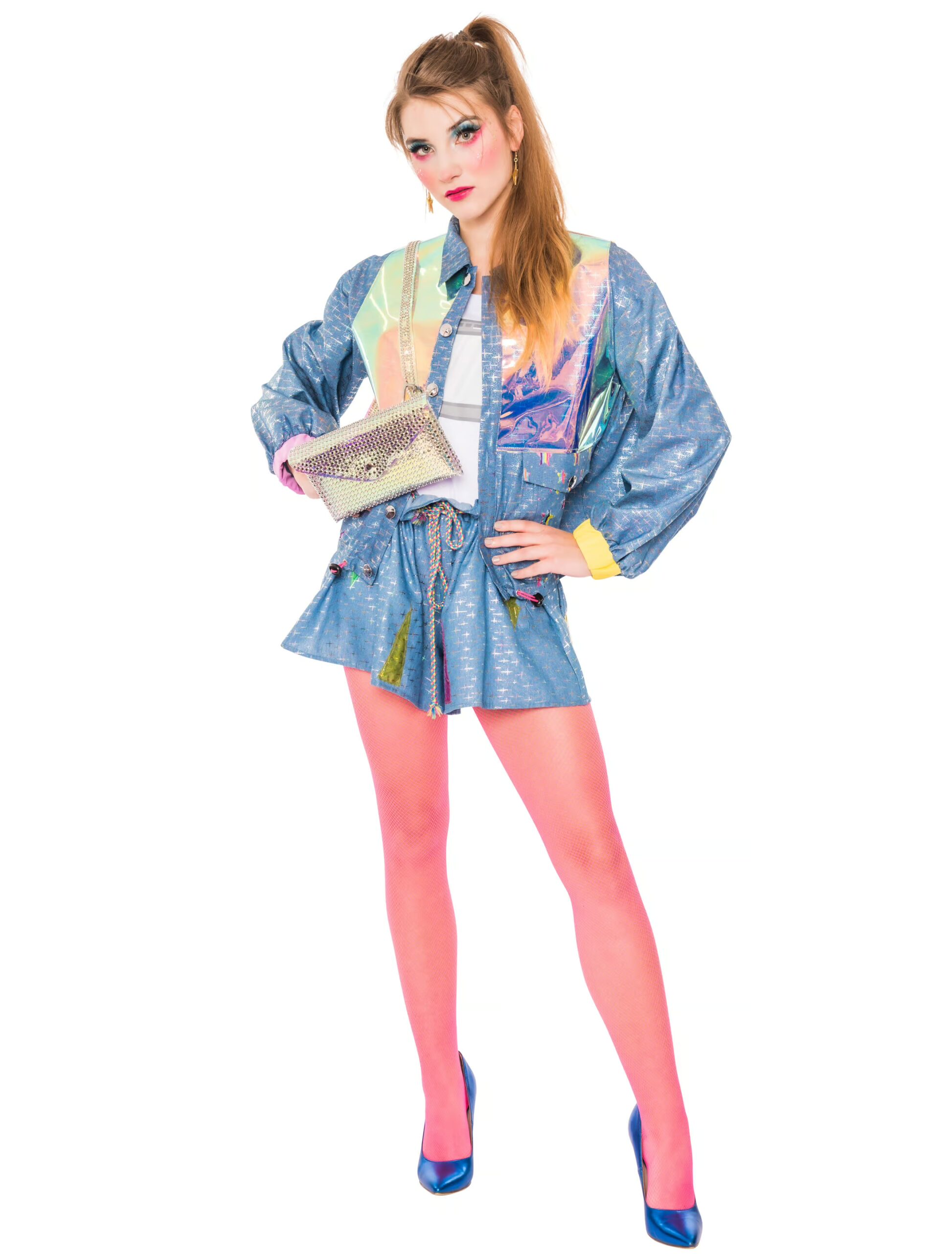 In dieser süßen mit Laserstoffpartien und zwei Taschen verzierten Jacke im Jeanslook bist Du der Star jeder Kostümparty. Auch für den Discobesuch eignet sich diese glänzend bunte Jacke, die vom Style her an die flippigen 70er- und 80er-Jahre erinnert. So eine außergewöhnliche Jacke kommt jedoch nur mit den passenden Accessoires wie einem farblich passenden Minirock, roter Perücke und getönter Brille zur Geltung. Wenn Du es etwas weniger auffällig magst, kombinierst Du diese Retro-Jacke einfach mit normaler Alltagskleidung.