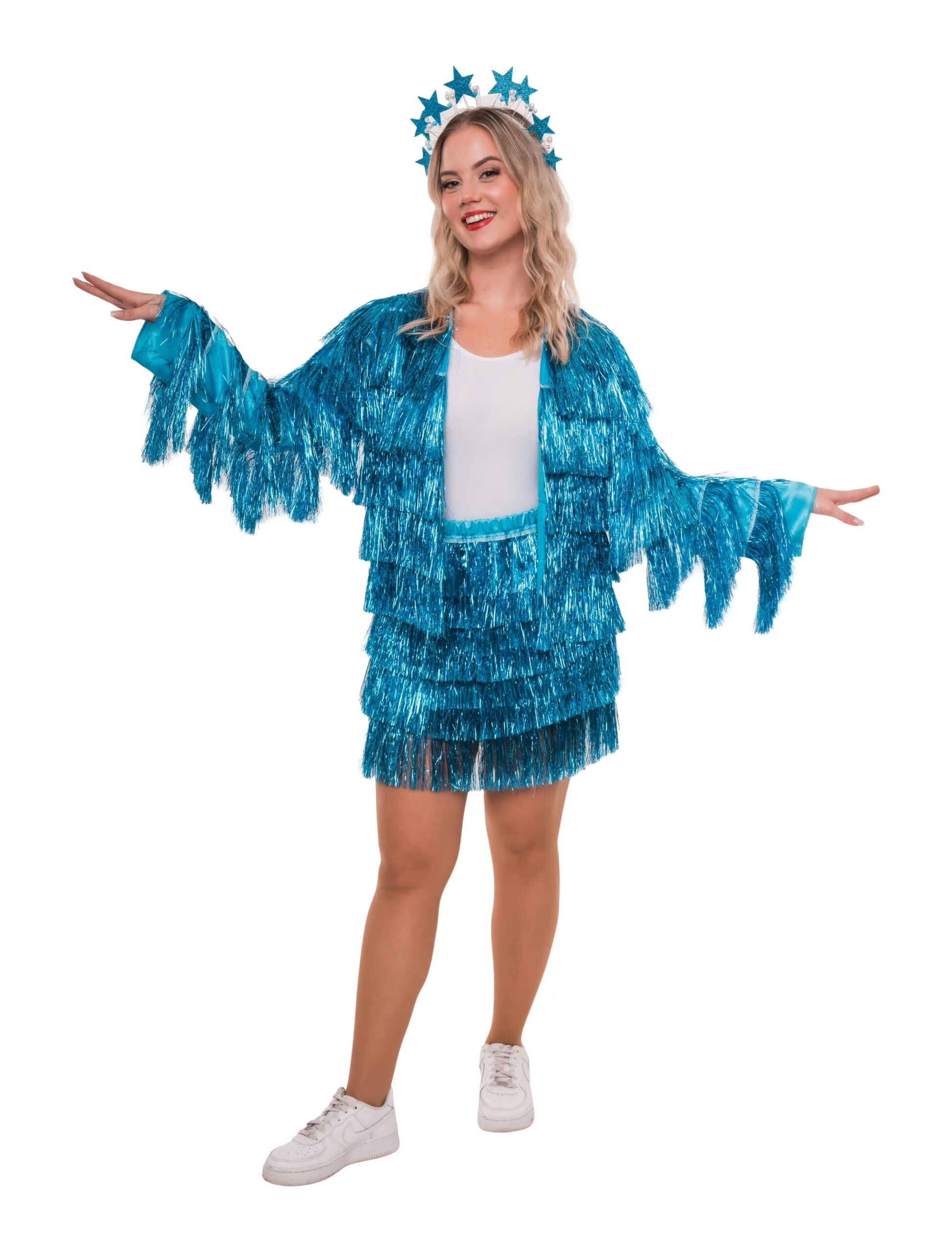 Mit unserer feinen Lametta Jacke für Damen bist du der funkelnde Mittelpunkt jeder Party! Diese außergewöhnliche Jacke ist gemacht für große Auftritte – glänzend, auffällig und voller Bewegung. Die langärmelige Jacke ist von oben bis unten in mehreren Lagen schimmerndem Lametta eingehüllt. Die feinen, glänzenden Streifen tanzen bei jeder Bewegung mit und erzeugen einen lebendigen, glitzernden Effekt, der garantiert für Aufmerksamkeit sorgt. Ob als Highlight fürs Festival, Karneval, die Bühne oder jede andere Gelegenheit, bei der du glänzen willst – mit dieser Jacke bist du bestens ausgestattet!