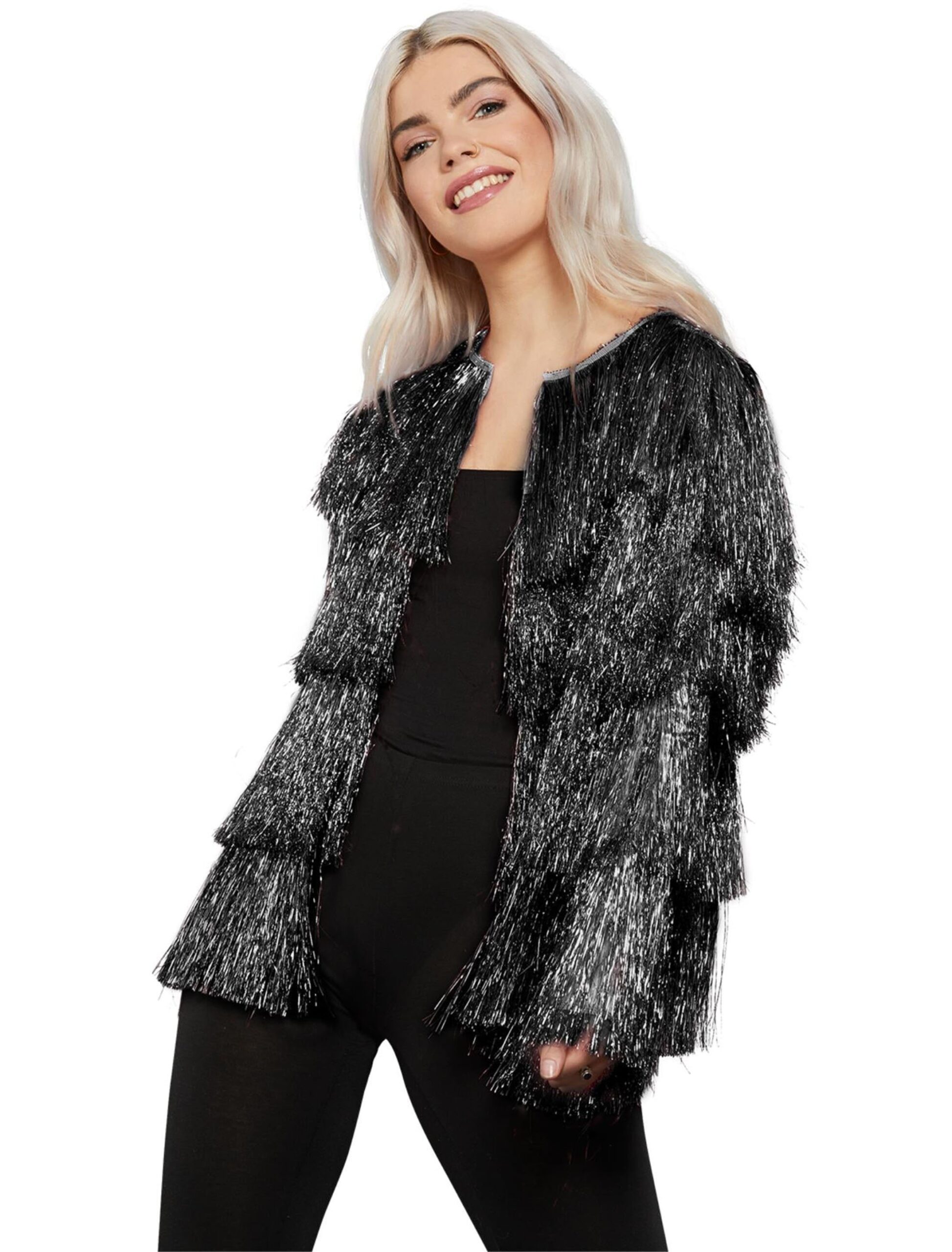 Unsere Jacke mit Fransen besteht komplett aus langen, dünnen Kunststoff-Fransen. Jeder Schritt und jede Bewegung wird zum Fransen-Feuerwerk! Ob Festival, Motto-Party oder Karneval – mit dieser Jacke wirst du garantiert nicht übersehen. Sie weht im Wind, glänzt im Licht und macht jedes Outfit zum absoluten Hingucker!