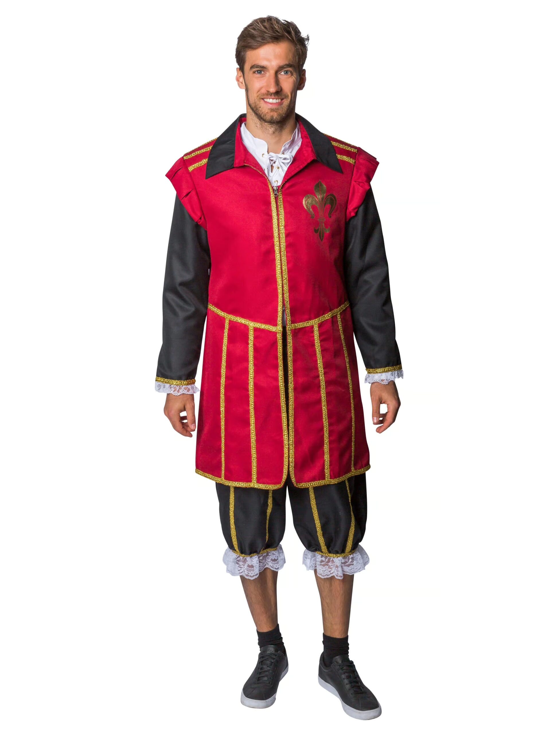 Einer für alle und alle für einen! Mit der Musketier Jacke für Herren kannst Du Dich als DArtagnan, Athos, Porthos oder Aramis auf den Karnevalszug begeben und beim Feiern den König vor Attentätern schützen. Die Jacke in den Farben Rot und Schwarz wirkt nicht nur sehr elegant, sondern wird auch von einer goldenen heraldischen Lilie geziert. Diese kannst Du beim Feiern voller Stolz auf der Brust tragen. Auf in den Party-Kampf! Die Jacke besitzt vorne einen Reißverschluss von ca. 30 cm.