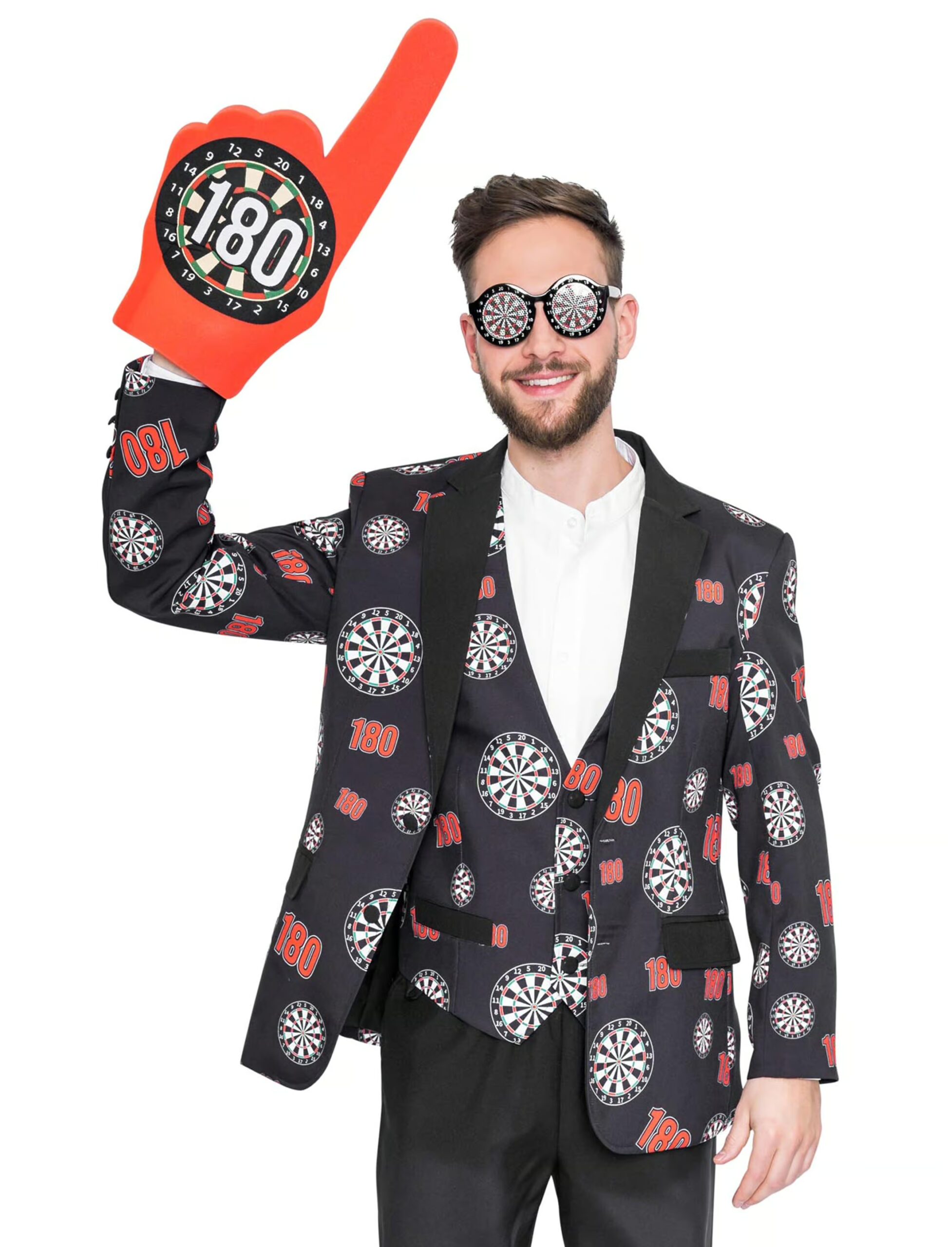 Bull’s Eye, Points und triple ring sind keine Fremdwörter für Dich? Dann kommt dieses edle Jackett für Dich wie gerufen! Der schwarze Stoff wird von Dartscheiben und der Nummer 180â€, die die maximalen Wurfpunkte sind, verziert. Unterhalb des schicken, schwarzen Revers und Kragens befinden sich zwei stoffbezogene, schwarze Knöpfe mit deren Hilfe Du das Darts-Jackett auch geschlossen tragen kannst. Zur Jacke passt übrigens unser Darts-Zubehör perfekt: Mit Hosenträgern, einer Weste, Tasche oder Brille wird Dein Kostüm zu einem ganz besonderen Hingucker!