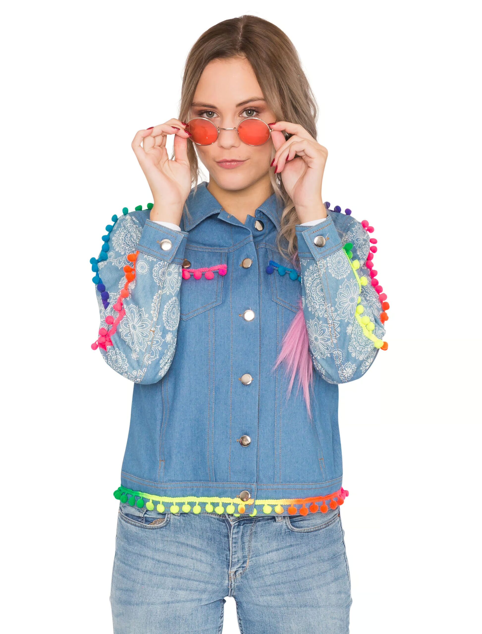 Genau die richtige Ergänzung zu Deinem Flower-Power- oder Hippie-Outfit! Diese Jeansjacke darf auf der nächsten Mottoparty nicht fehlen. Die Jacke ist mit silbernen Knöpfen aus Metall ausgestattet und ist an den Ärmeln mit einem schönen Paisley-Muster bedruckt. Es befinden sich zwei Brusttaschen mit Knöpfen und zwei kleinen Bauchtaschen, die nicht zu verschließen sind, an der Jacke. Die Jacke ist in der Front mit Knöpfen zu schließen. Die Ärmel können jeweils mit einem Knopf zugeknöpft werden. An den Schultern, am unteren Saum sowie an den Ärmelseiten und den Brusttaschen zieren regenbogenfarbene Bommel die Jacke. Ein schönes Kostümteil für Karneval und Fasching.