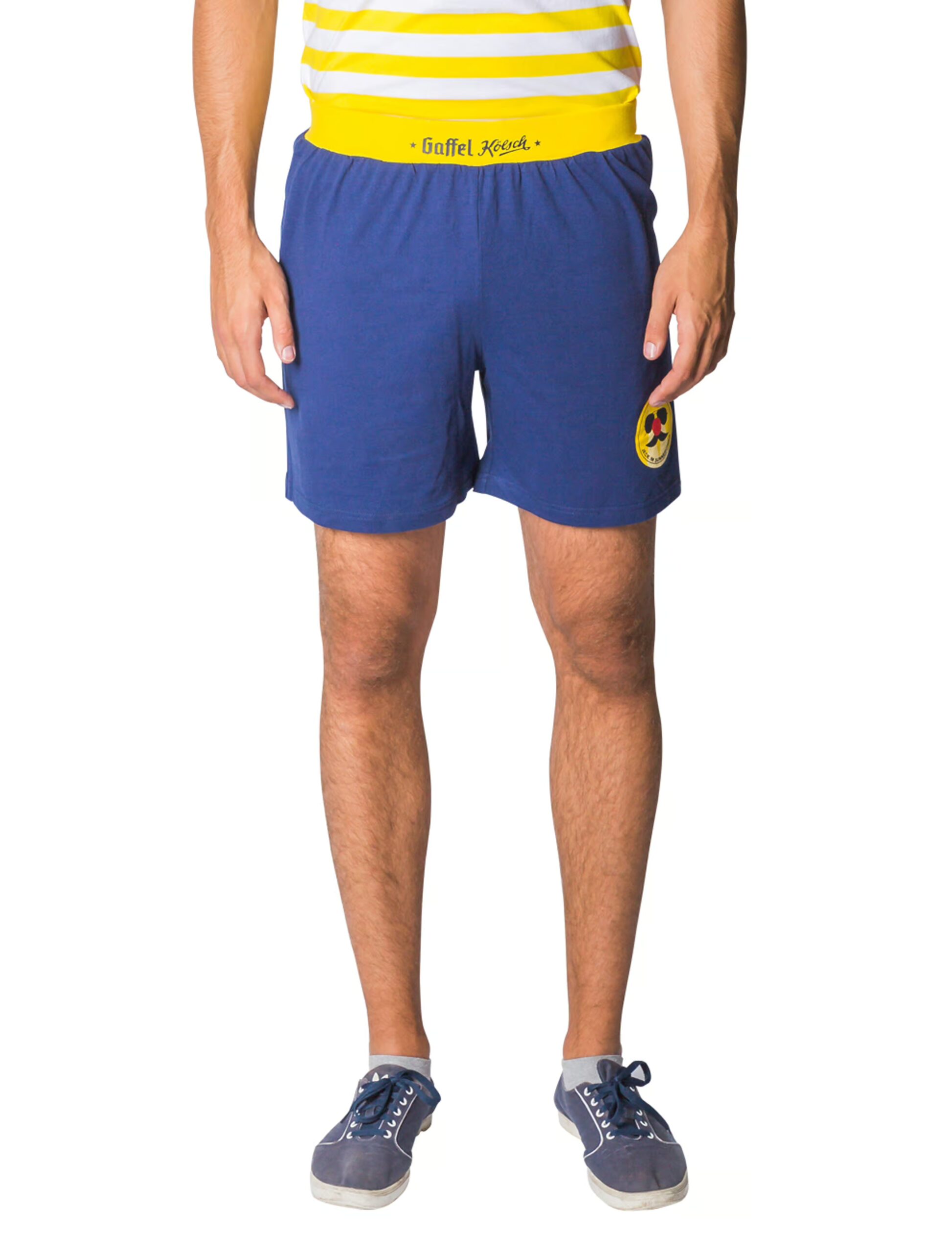 Schunkeln, feiern, bützen, singen – und das unter strahlend blauem Himmel und herrlichem Sunnesching! Du bist noch auf der Suche nach einem luftigen Sommer-Outfit? Dann ist diese blaue Herren Shorts ein sehr guter Anfang. Sie ist durch den gelben Gaffel-Gummizug nicht nur bequem und trendy, sondern passt auch durch den gelben Jeck im Sunnesching-Aufnäher, der ein Gesicht mit Sonnenbrille, roter Pappnase und Schnäuzer zeigt, perfekt zur bevorstehenden Sommerparty! In Kombination mit Baseball-Cap, Sonnenbrille, Shirt und Flip Flops die perfekte Kombi für hochsommerliche Temperaturen und eine jeile Zick! Model ist 190 cm groß und trägt die Shorts in Größe L.