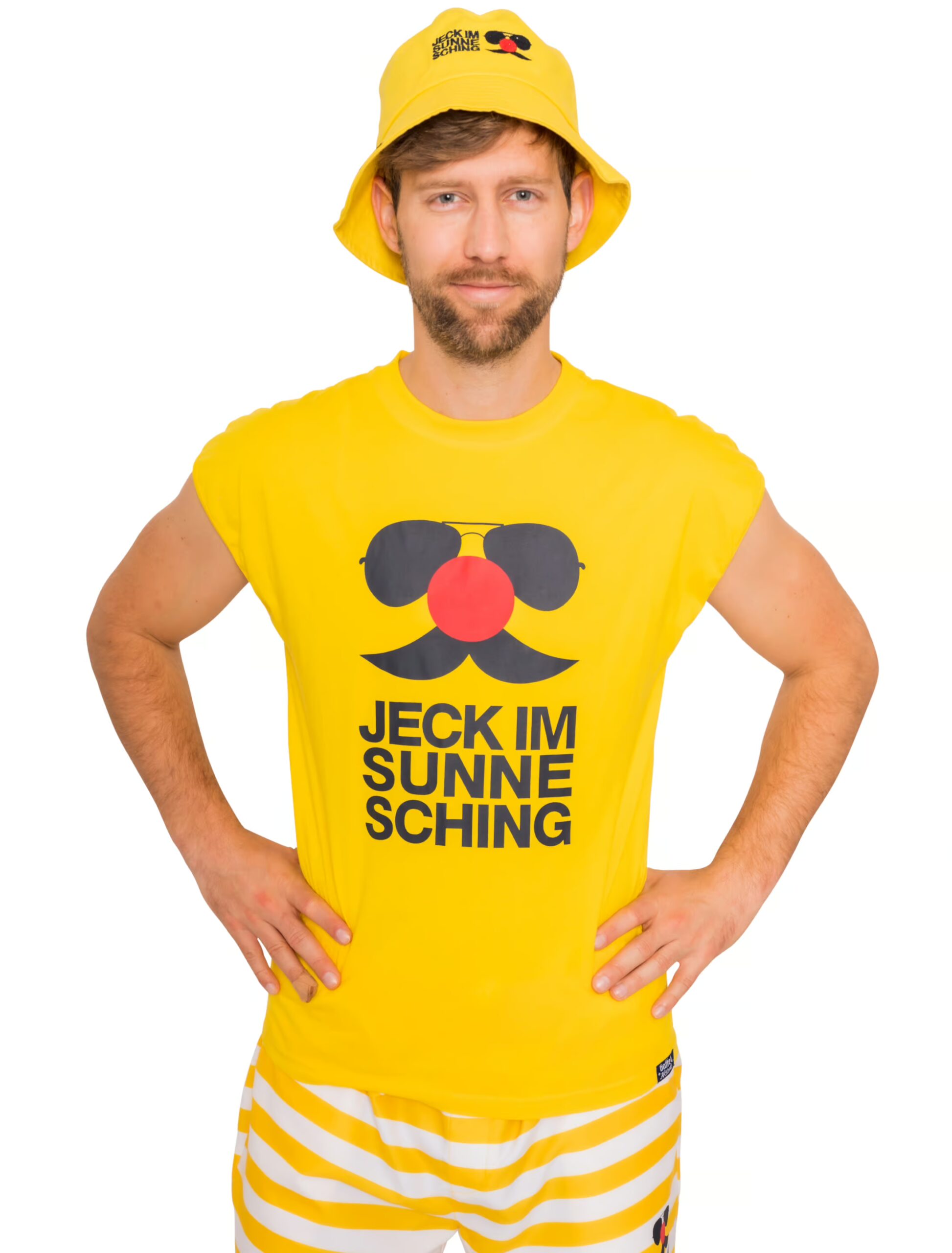 Dieses strahlend gelbe Original Jeck im Sunnesching Muskelshirt für Herren besteht aus reiner Baumwolle und ist in der Front mit dem auffälligen Schriftzug JECK IM SUNNESCHING sowie dem lustigen Sunnesching-Logo (Gesicht mit Sonnenbrille, roter Pappnase und Schnäuzer) verziert. Das ideale Kleidungsstück für die nächste Sommer- oder Grillparty mit dem Thema “Jeck im Sunnesching”! Kombiniere das T-Shirt mit der Shorts, dem Fischerhut, der Jeck im Sunnesching Brille sowie der Bauchtasche für den perfekten JIS-Look! Unser Modell ist 184 cm groß und trägt das T-Shirt in Größe M.