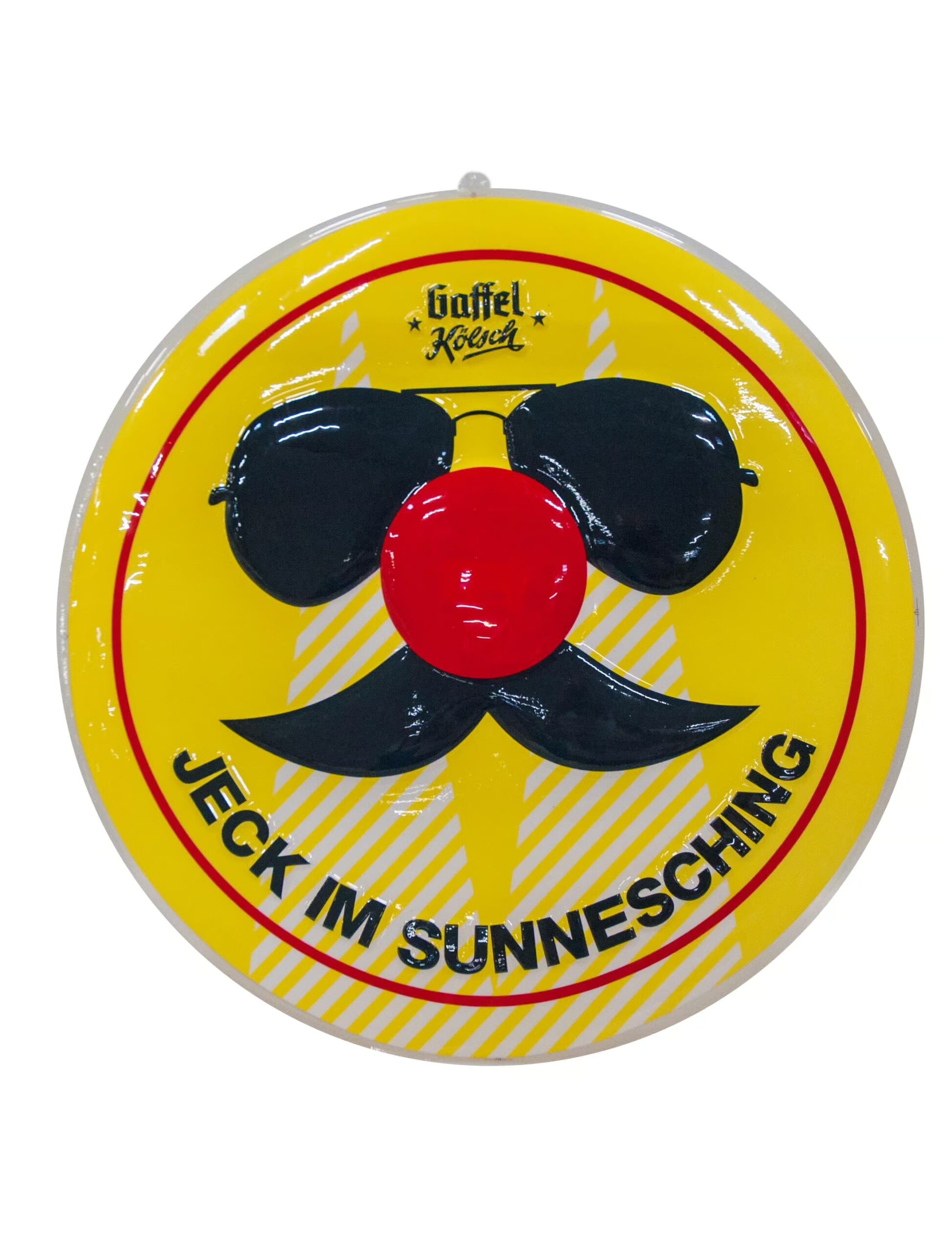 Möchtest Du eine große Jeck im Sunnesching-Karnevalsparty bei Dir im Garten veranstalten und alle Deine Freunde einladen? Dir fehlt aber noch die passende Deko? Dann halten wir neben der hübschen Wimpelkette noch einen tollen Hingucker für Dich bereit: Diese Wanddeko überzeugt sowohl durch ihr cooles Retro-Design, als auch durch den sommerlichen Jeck mit Sonnenbrille, Pappnase und Schnäuzer. Die Schriftzüge JECK IM SUNNESCHING und Gaffel Kölsch runden die fröhliche Party-Deko perfekt ab! Maße: 60 x 60 cm.