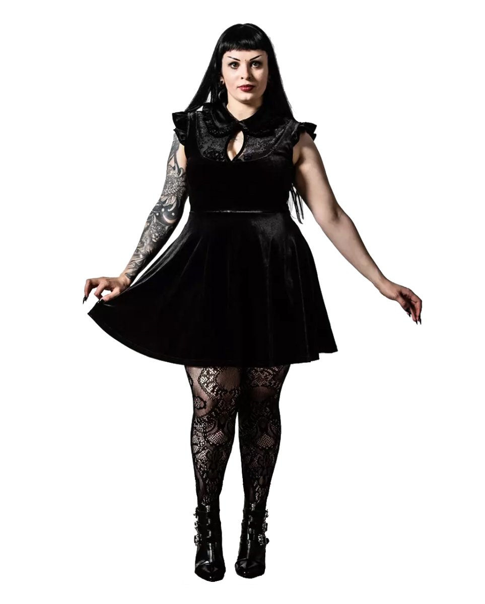 Schwarzes Amaymon Kragenkleid von KILLSTAR Weiches Gothic Kleid aus Samt für festliche Anlässe Sichere dir dieses wunderschöne Gothic Festtagskleid! Unser schwarzes Amaymon Kragenkleid von KILLSTAR überzeugt mit sexy Ausschnitt und Rüschenärmeln – ideal für Heiligabend, Silvester und andere Events. Dieses traumhafte Kleid von KILLSTAR ist bis Größe XL verfügbar und zaubert eine schöne Silhouette. Der Stoff ist leicht dehnbar und liegt angenehm auf der Haut. Trage hierzu Pumps und süße Rüschensocken, damit der Look komplett wird. Lieferumfang: 1 x Schwarzes Amaymon Kragenkleid von KILLSTAR Farbe: Schwarz Größe: S, M, L, XL Material: 92% Polyester, 8% Elasthan Schwarzer Samtstoff Samt-Paneel als Eyecatcher Kragen mit Peephole-Ausschnitt Figurbetont geschnitten Schlanker Rock Kalt waschen – Schonwaschgang Größe: S M L XL EU 38 40 42 44 UK 10 12 14 16 US 6 8 10 12 Brustumfang: ca. 87 cm ca. 92 cm ca. 97 cm ca. 102 cm Taillenumfang: ca. 69 cm ca. 74 cm ca. 79 cm ca. 84 cm Hüftumfang: ca. 94 cm ca. 99 cm ca. 104 cm ca. 109 cm Der Artikel ist für Erwachsene. Nicht für Kinder unter 3 Jahren geeignet. Kann Kleinteile enthalten, die verschluckt werden können – Erstickungsgefahr. Von Feuer und offenen Flammen fernhalten.