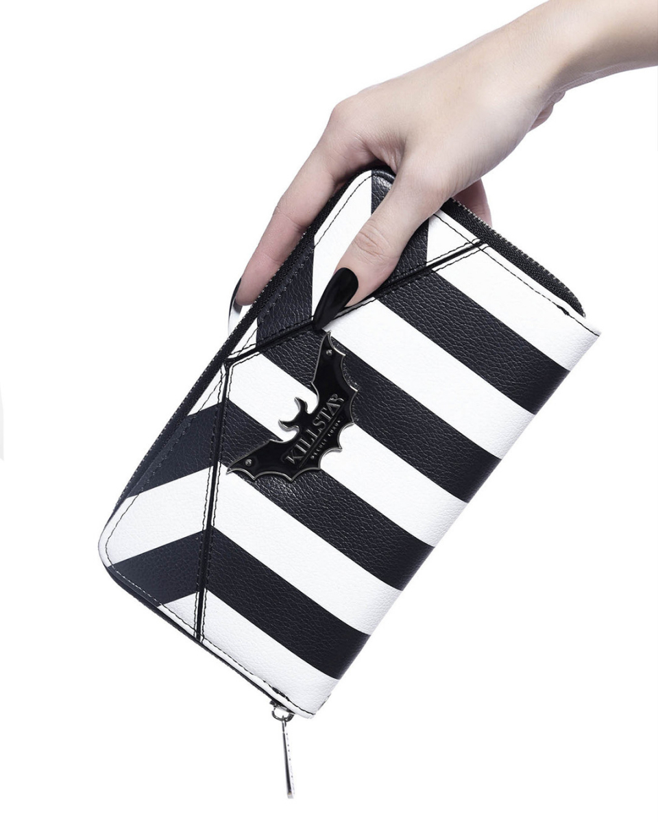 Never Trust the Living Geldbörse von Killstar Stylisches Gothic Portemonnaie mit Fledermaus Applikation Nimm die fantastische Never Trust the Living Geldbörse von Killstar mit, wenn du deine Gruft verlässt. Das Goth Portemonnaie mit Fledermaus Applikation passt so perfekt zu deinem alternativen Gothic Outfit wie eine Fledermaus auf den nächtlichen Friedhof. Die Never Trust the Living Geldbörse von Killstar ist ein Kunstleder Portemonnaie, das mit schwarz-weißen Streifen sehr elegant aussieht. Die kleine schwarze Fledermaus Applikation gibt einen Hinweis auf deine düstere Gesinnung. Lieferumfang: 1 x Never Trust the Living Geldbörse von Killstar Farbe: Schwarz, Weiß Größe: ca. 20 x 12 cm Material: Kunstleder, Metall Gestreiftes Design Mit Reißverschluss Mit Fledermaus Applikation Mehrere Fächer Nicht für Kinder unter 3 Jahren geeignet. Kann Kleinteile enthalten, die verschluckt werden können – Erstickungsgefahr.