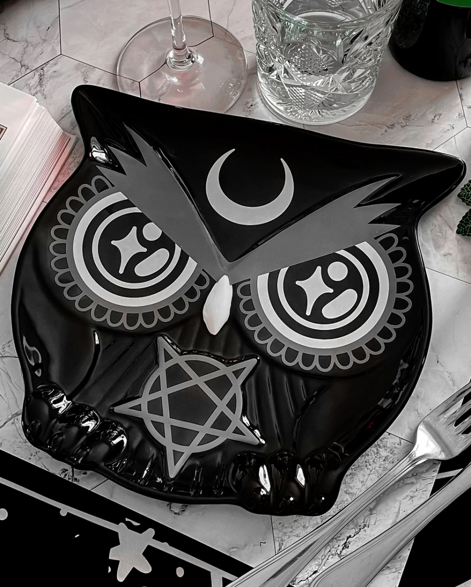 Owl Servierteller Gothic Keramik Teller von KILLSTAR Extravagantes Gothic Keramik Teller im Eulen Design mit okkulten Symbolen Werde deiner Liebe zu mystischer Deko auch beim Dinner gerecht. Der Owl Servierteller Gothic Keramik Teller von KILLSTAR wird von einer Vielzahl an mystischen Zeichen verziert, so dass es deinem Essen einen ganz besonderen Spirit verleiht. Der Owl Servierteller Gothic Keramik Teller von KILLSTAR ist mit einer Größe von ca. 23 x 24,5 cm groß genug, um dem eindrucksvollen Eulen Design genügend Raum zu geben. Die Eule mit dem okkulten Flair begeistert mit einigen wunderbar mystischen Details. Lieferumfang: 1 x KILLSTAR Owl Servierteller Farbe: Schwarz, Grau, Weiß Größe: ca. 23 x 24,5 cm Material: Keramik Glänzend schwarze Keramik Auffälliges Eulen Design mit Pentagramm Fantastischer Gothic Teller für dunkle Seelen Der Artikel ist ein Gothic Geschirr. Nicht für Kinder unter 3 Jahren geeignet. Kann Kleinteile enthalten, die verschluckt werden können – Erstickungsgefahr. Von Feuer und offenen Flammen fernhalten.