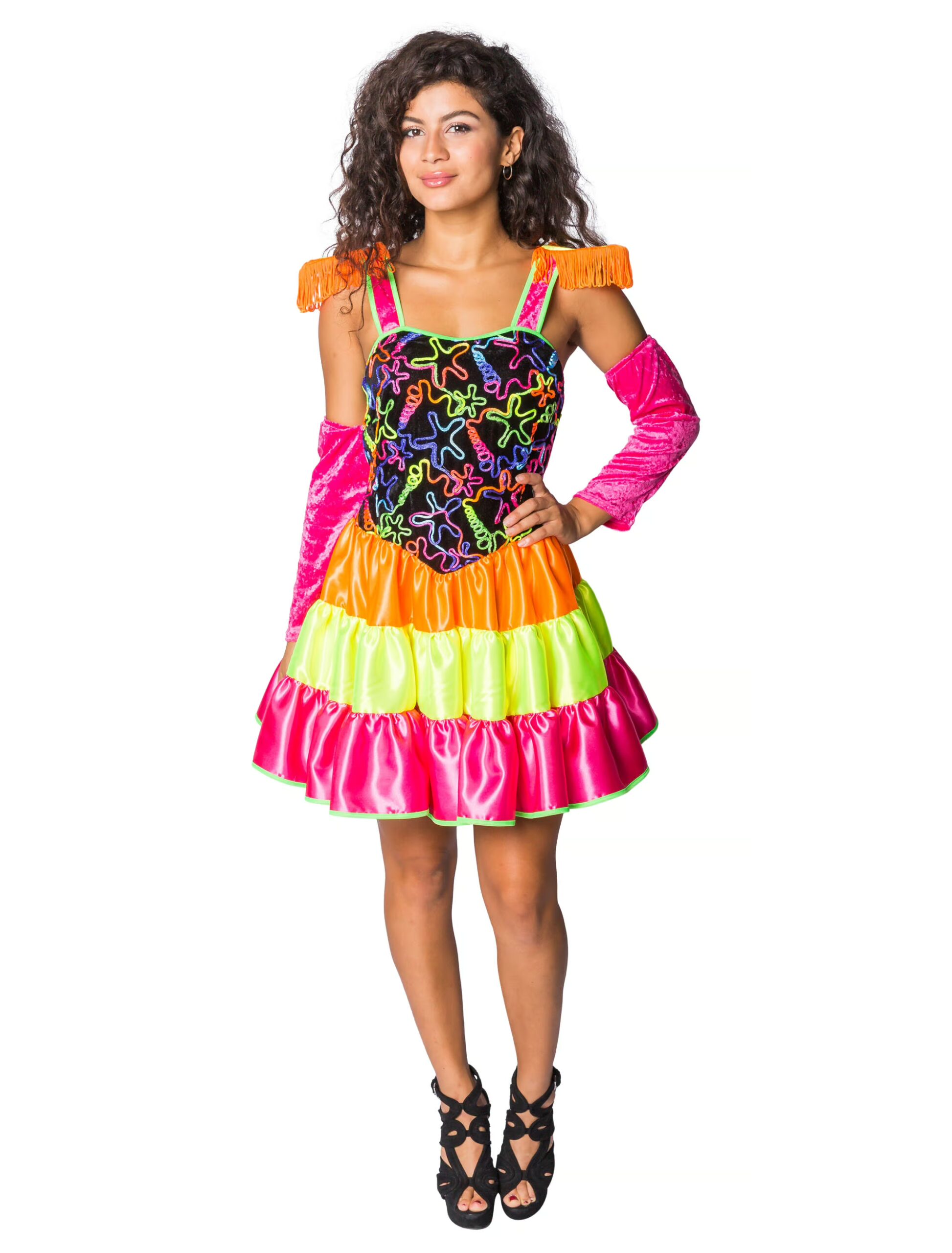 Bist Du bereit für ein aufregendes Farbspiel? Dann wirst Du dieses kunterbunte Damen Kostüm im Stil der wilden 80er lieben! Während das Oberteil des Kleids durch den schwarzen Stoff mit neonfarbigen Mustern besticht, überzeugt der Rockteil durch den weit ausgestellten Stoff in Neonorange, Neongelb und Neonpink. Passend dazu gehören zum 80er-Jahre-Kleid die pinken Armstulpen. Weitere farbenfrohe Details sind zum Beispiel die Schulterklappen mit Fransen. Ein extravagantes Kleid, das auf jeder Motto- und Karnevalsparty (knallbunte) Akzente setzt!