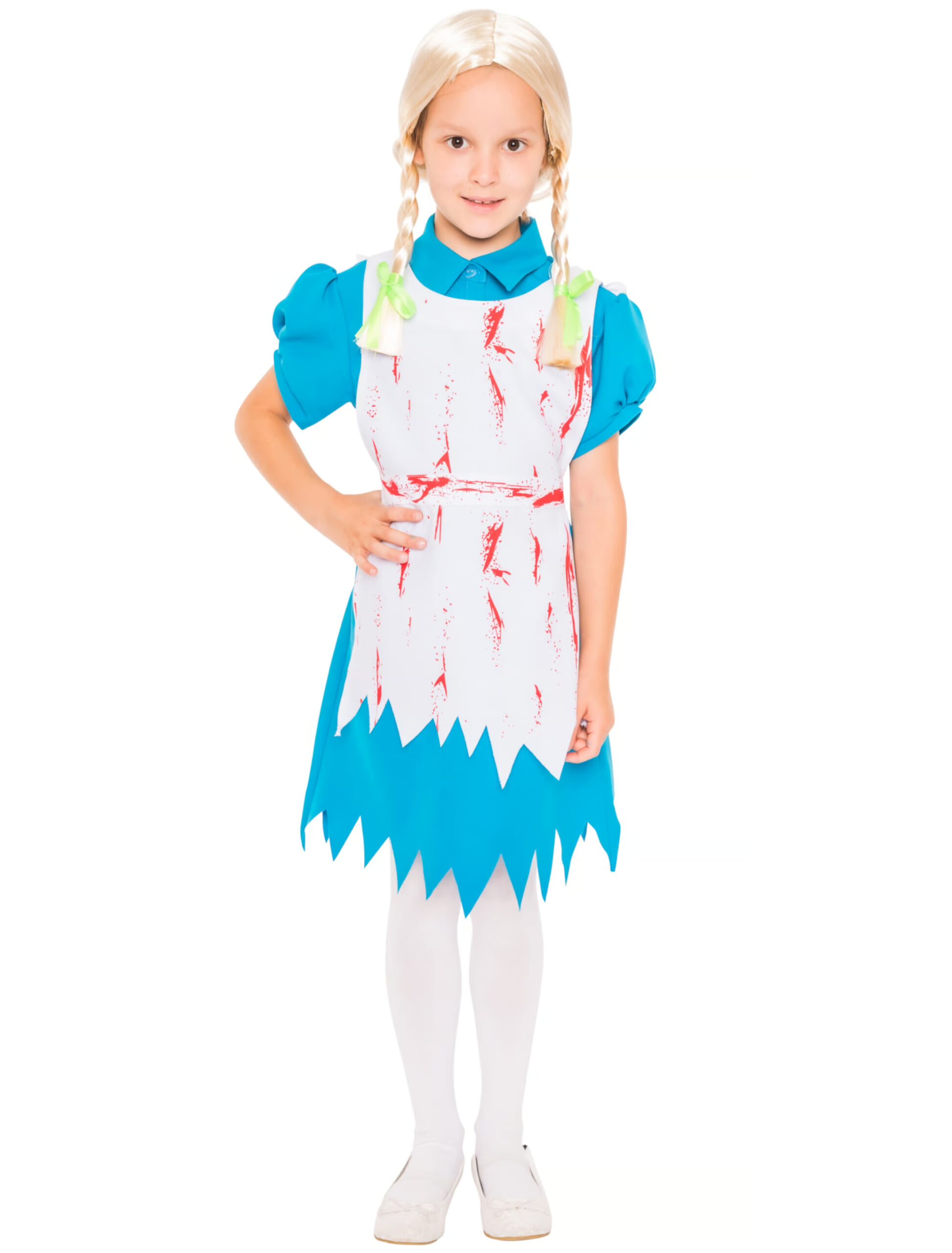 Mit diesem blau-weißen, mit Blut verschmierten Alice Kinderkleid und einer blonden Perücke aus unserem Shop hast Du ein super Halloween- und Horrorkostüm für Deine Kleine, das sie auch zum Fasching, Karneval und Halloween gern tragen wird. In diesem blauen Kleid wirkt Deine Kind auf den ersten Blick mit Bubikragen und kurzen Puffärmeln recht brav, aber bei näherer Betrachtung mit zerfetztem Kleider- und Schürzensaum sowie der blutbefleckten Schürze ist sicher, das es sich hier um eine Horror- oder Zombie-Alice handelt, der Du besser aus dem Weg gehen solltest.