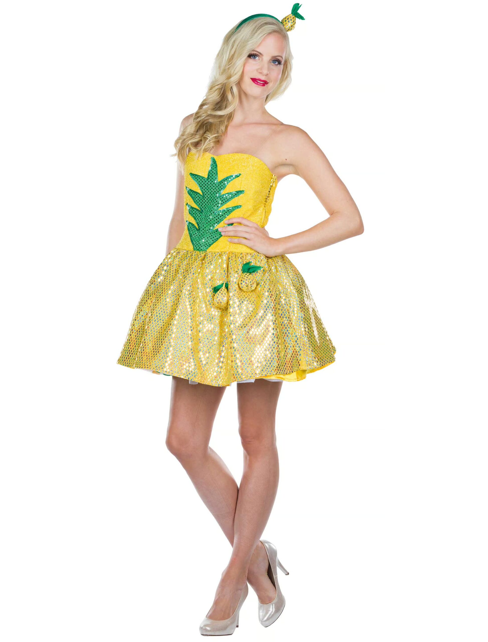 Magst Du auch gerne Cocktails? Mit diesem traumhaften Ananas-Kleid bringst Du schon eine wichtige Zutat eines bekannten Klassikers zur nächsten Cocktail-Party mit. Vielleicht findest Du ja dort auch die passende Kokosnuss und wenn dann noch Rum ins Spiel kommt… Nun, vielleicht überlassen wir das besser Deiner Fantasie. Dieses Kleid ist jedenfalls auf eine ganz individuelle Art und Weise ein besonders erfrischender, fruchtiger Traum. Der kurze, glänzende Rock mit den aufgesetzten Ananas-Applikationen und das dazu passende, schulterfreie Oberteil mit farblich abgestimmten Pailletten, die das stilisierte Motiv einer Ananas-Blattkrone zeichnen, sind ein Garant für die Aufmerksamkeit der anderen Gäste. Der passende Haarreif komplettiert dieses humorvolle Set, das Dich zu einem aufregenden Blickfang machen wird.
