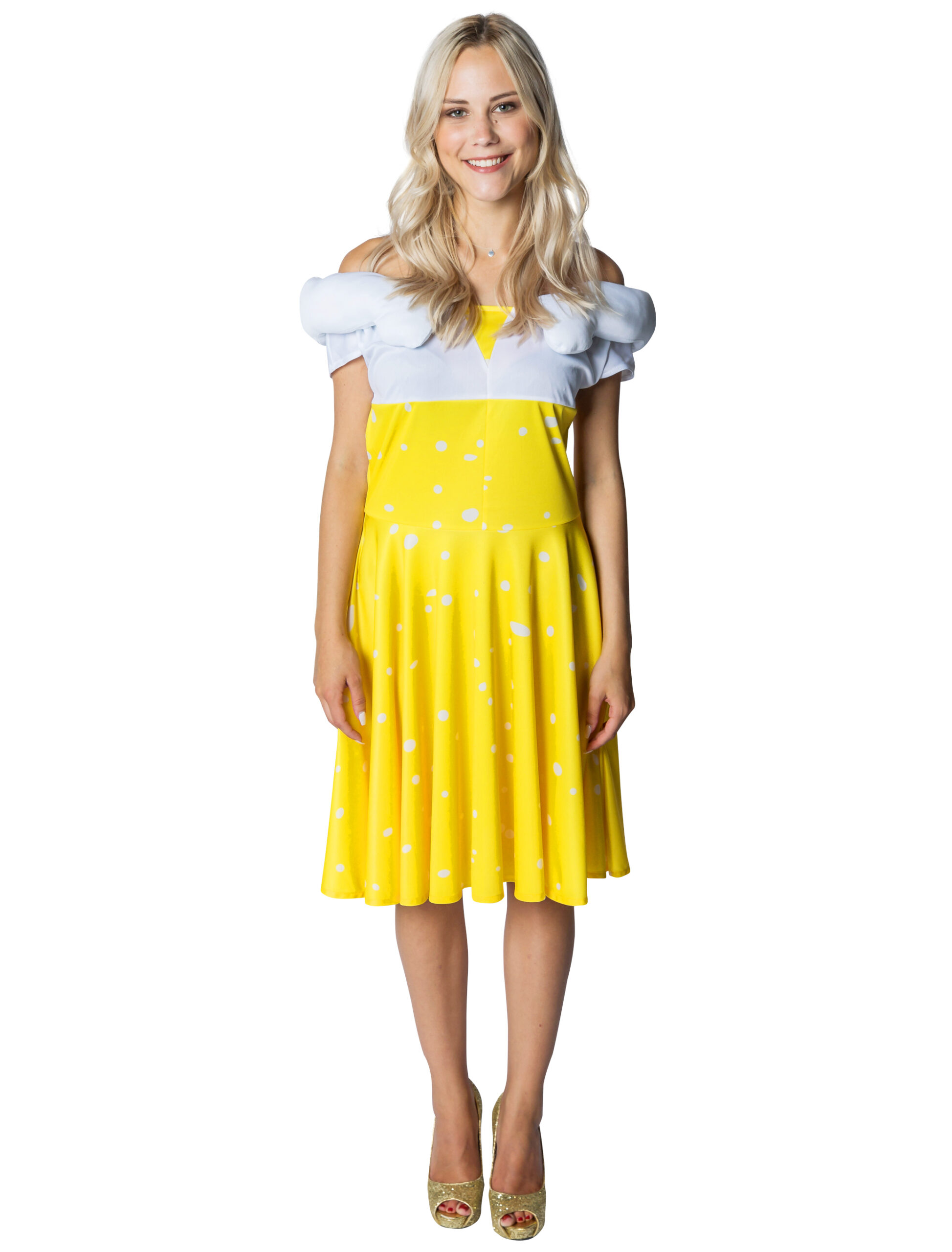 Mit unserem schicken Bier Kleid kannst Du Dich als “Kühles Blondes” auf die nächste Karnevalsparty begeben. Aber auch als Fun Dress für den Besuch auf dem Oktoberfest ist das alkoholische Kostüm für Damen bestens geeignet. Prickelnd perlt das Kleid an Deinem Körper entlang und bildet im Brustbereich eine leckere Schaumkrone, diese istt durch Knöpfe abnehmbar. In vielen Größen kannst Du das Dress aus flüssigem Gold bei uns im Shop bestellen und wirst damit garantiert jeden Mann um den Finger wickeln können. Lustige Blubberblasen runden das gelbe Kleid für Mottopartys ideal ab und machen es zu einem wahren Blickfang.