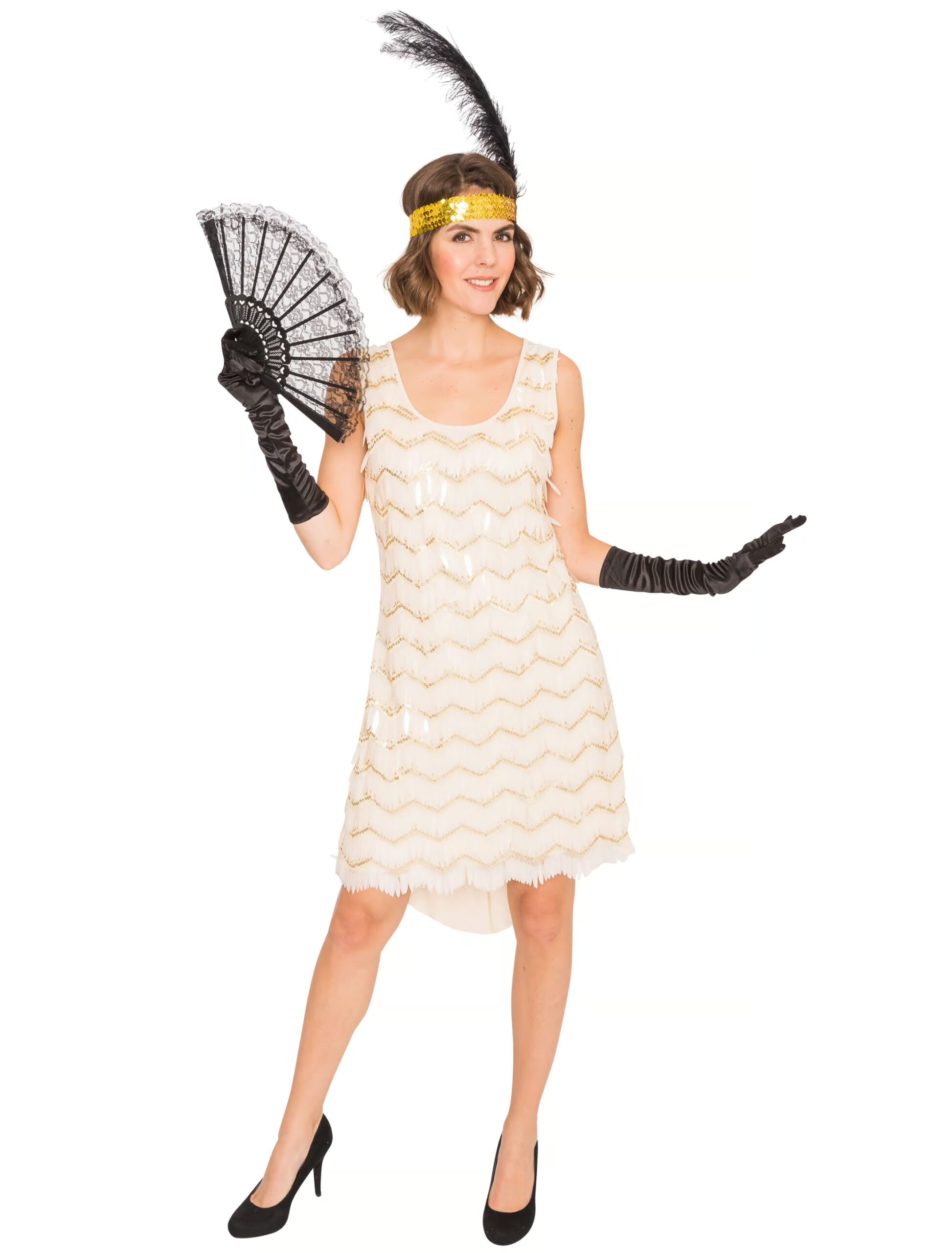 In Gold und Beige kannst Du unser schickes Charleston Kleid für Damen bestellen und Dich damit in die Goldenen 20er Jahre begeben. Das luftige Dress mit gezacktem Muster und Fransen ist ein wahrer Hingucker auf jeder Tanzfläche und macht Dich zu einer attraktiven Diva auf jedem Karnevalsfest. Aber auch für eine 20er Jahre Mottoparty kannst Du das Kleid für Ladys prima nutzen und den ein oder anderen Gentleman zum Tanz auffordern. Dazu passen ein Fächer, Kopfschmuck mit Feder und oder eine Long Zigarette, die Du genüsslich an der Bar rauchen kannst. Das ärmellose Kleid besitzt am Rücken einen Reißverschluss.