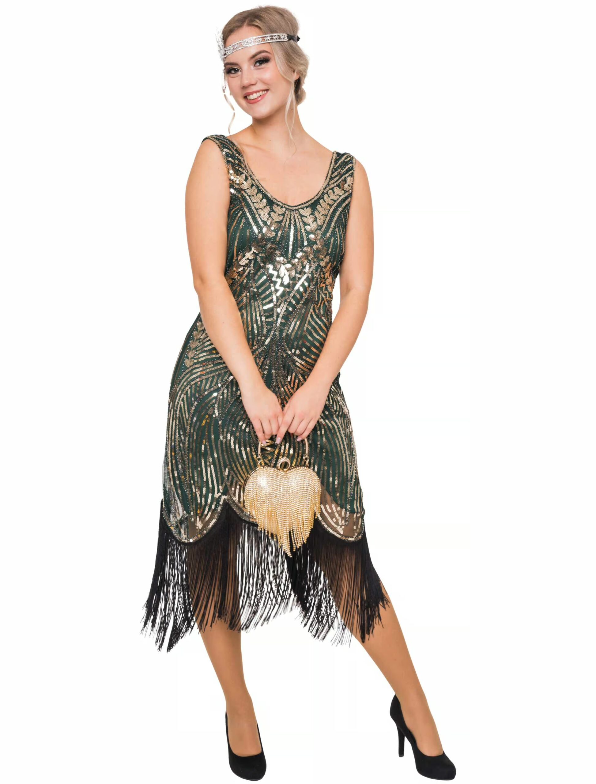 Mit unserem zauberhaften Charleston Kleid wirst du zum Star jeder Tanzfläche! Die fröhlichen Fransen und der glitzernde Stoff lassen dich bei jedem Schritt swingen und schwingen – ganz wie die Flapper-Girls in den wilden 20ern. Egal, ob du gerade eine Runde Charleston drehst oder einfach nur die Eleganz des Jahrzehnts ausstrahlen willst, dieses Kleid macht dich zur Queen der Nacht. Perfekt für Mottopartys, Silvesterfeiern oder einfach, wenn du das Leben in vollen Zügen genießen möchtest. Wirf dir ein paar Perlen um den Hals und lass die Musik beginnen – du wirst der absolute Hingucker des Abends!
