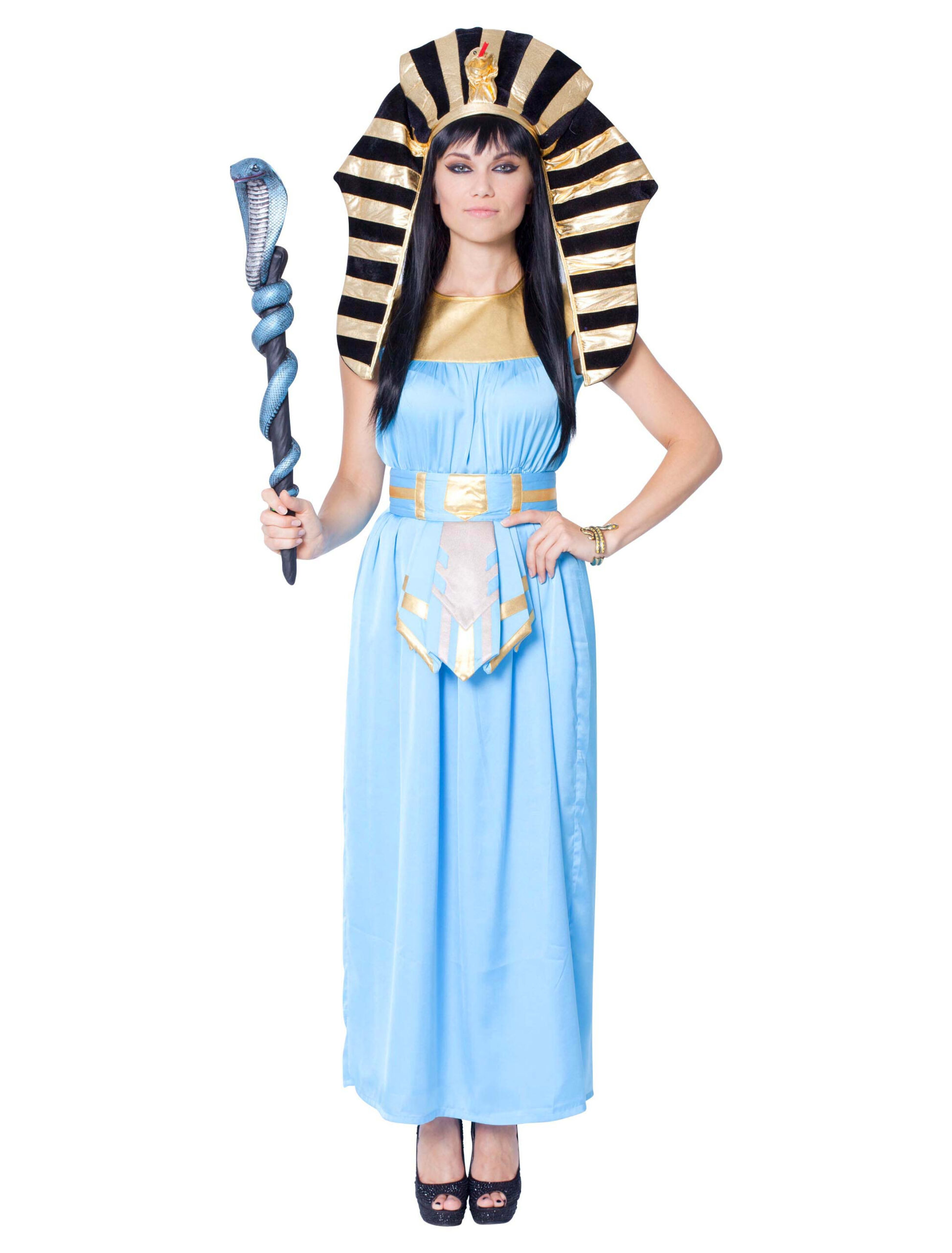 Eine der mächtigsten Frauen der Antike war Cleopatra, die Herrscherin Ägyptens und Geliebte mächtiger römischer Imperatoren. Von ihr heißt es, sie habe täglich in Eselsmilch gebadet, um ihre unvergleichliche Schönheit zu erhalten. Natürlich hast Du das nicht nötig, denn dieses schlichte, knöchellange Kleid in Hellblau und Gold unterstreicht Deine natürliche Attraktivität. Das Design des stylischen Gürtels wurde klassischen Mustern nachempfunden und betont Deine Figur. Gleichzeitig lenkt das Gesamtbild dieses ärmellosen Kleids die Aufmerksamkeit auf Deine schöne Ausstrahlung. Wetten, dass Du damit auf der nächsten Kostümparty nicht nur machtvollen Imperatoren und bedeutsamen Herrschern den Kopf verdrehen wirst? Das perfekte Faschingskostüm zu jeder Karnevals- oder Mottoparty. Fehlt nur noch die passende Kopfbedeckung und das Zepter mit der Kobra.