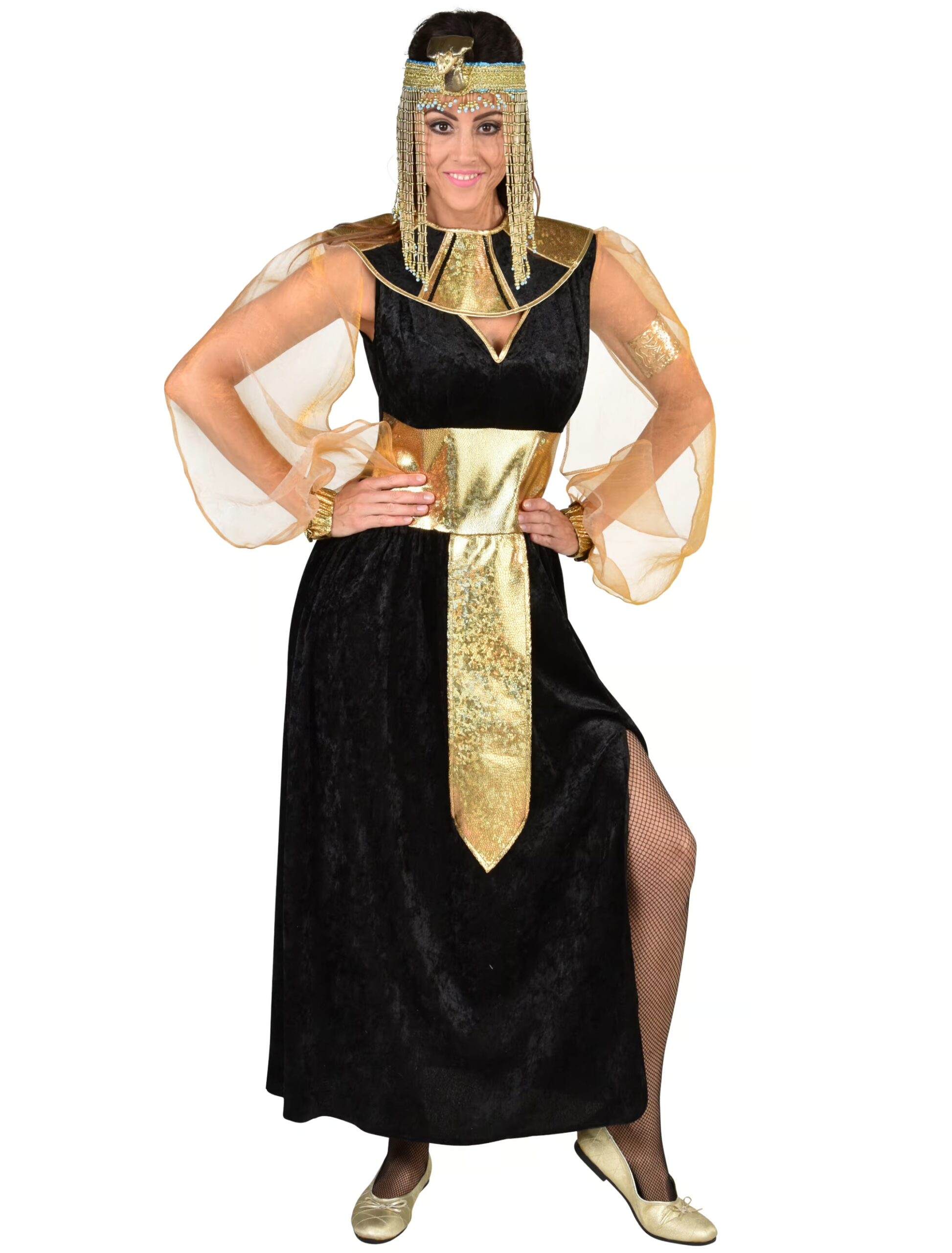 Mit diesem aufwendig gearbeiteten Kleid trittst Du in die Fußstapfen der legendären Cleopatra, von der niemand die Blicke abwenden kann. Das schwarz-goldene, mit vielen Verzierungen versehene Kleid besteht aus pflegeleichtem Polyester. Oberteil und Rock sind aus samtähnlichem Stoff gefertigt. Besondere Details sind der breite goldverzierte Gürtel und Kragen sowie die an den Handgelenken mit Goldborte versehene Tüllverzierung an den Ärmeln. Ein schönes Kostüm zu verschiedenen Themenpartys zu Karneval und Fasching!