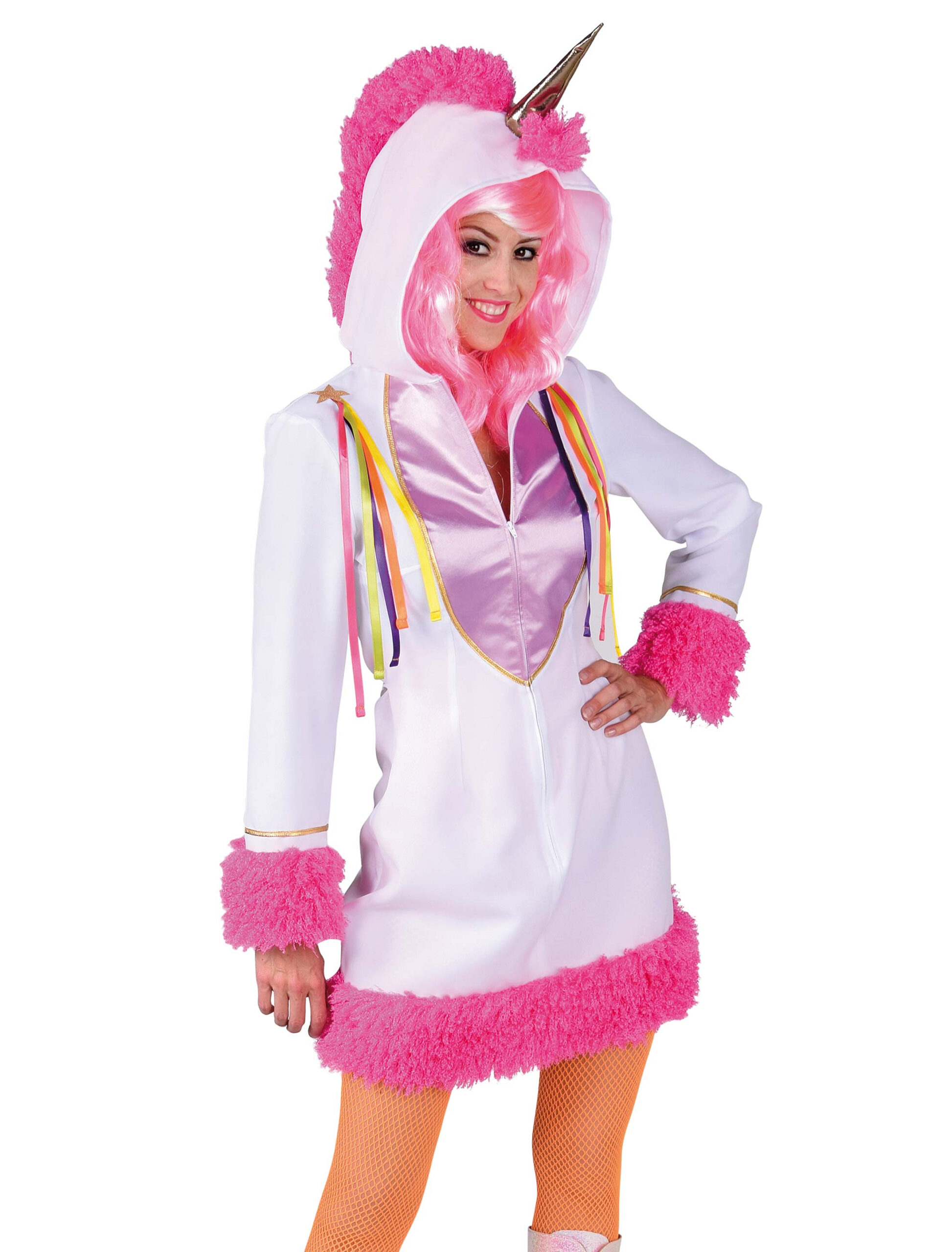 Tauche ein in die bunte Welt der Fabelwesen! Mit diesem märchenhaften Einhorn Kostüm für Damen gönnst Du Dir Deine wohlverdiente Auszeit vom Alltag. Schlüpfe dazu einfach in das kuschelig-weiche Einhorn Kleid und schließe den Reißverschluss. Das süße Kleid ist mit pinker Mähne an der Kapuze, an den Ärmelsäumen und am Kleidsaum verziert. Der glänzende Stoff in der Front, die auf den Schultern befestigten Bänder in Regenbogenfarben und das goldene Einhorn verwandeln Dich in das süßeste Fabelwesen jeder Kostüm- und Mottoparty!
