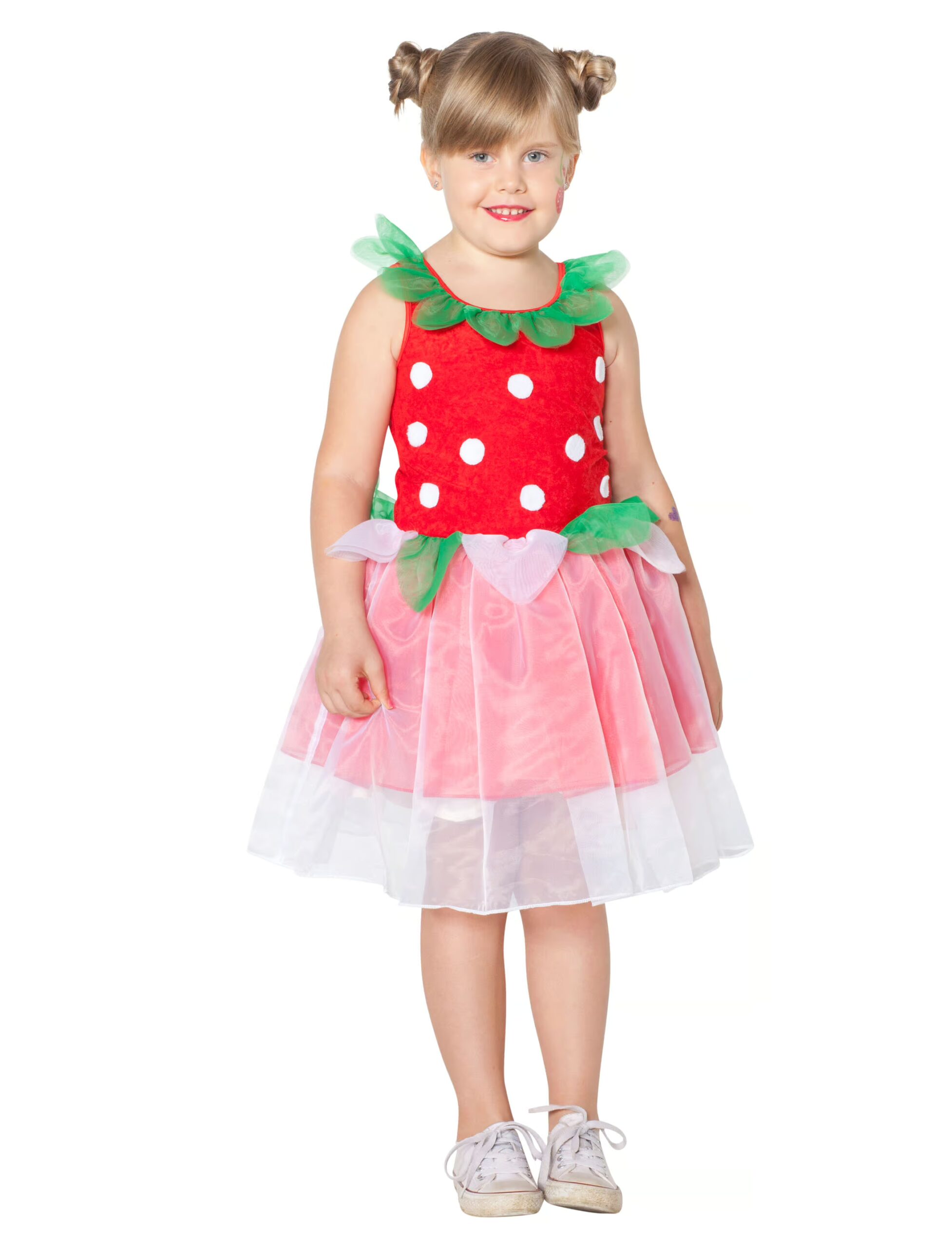 Erdbeeren zählen zu Deinem Lieblingsobst. Warum nicht auf der nächsten Kinderkarnevalsparty als süße Erdbeere verkleiden? Mit unserem tollen Erdbeere-Kostüm für Mädchen wirst Du zum hübschen Blickfang auf jeder Party! Die tollen Farben des Kostüms und der schicke Schnitt werden Dich überzeugen. Der obere Bereich des Kleids besteht aus einem roten Stoff, der mit weißen Punkten verziert ist. Der grüne Kragen in Form von Blättern lässt keinen Zweifel zu: Hier handelt es sich um eine Erdbeere! Der rote Kleiderrock und der weiße Unterrock werden umgeben von einem tollen, weißen Tüllstoff, der dem Erdbeere Kleid Leichtigkeit verleiht. Die weißen und grünen Tüllblätter in Hüfthohe runden Deinen fruchtigen Auftritt perfekt ab! Schließbar ist das Mädchen Kostüm auf der Rückseite durch einen Reißverschluss. Bei Deinem Anblick wird keiner mehr behaupten, Obst sei langweilig! Dieses Kostüm ist auch in Kleinkindergrößen sowie Babygrößen erhältlich.