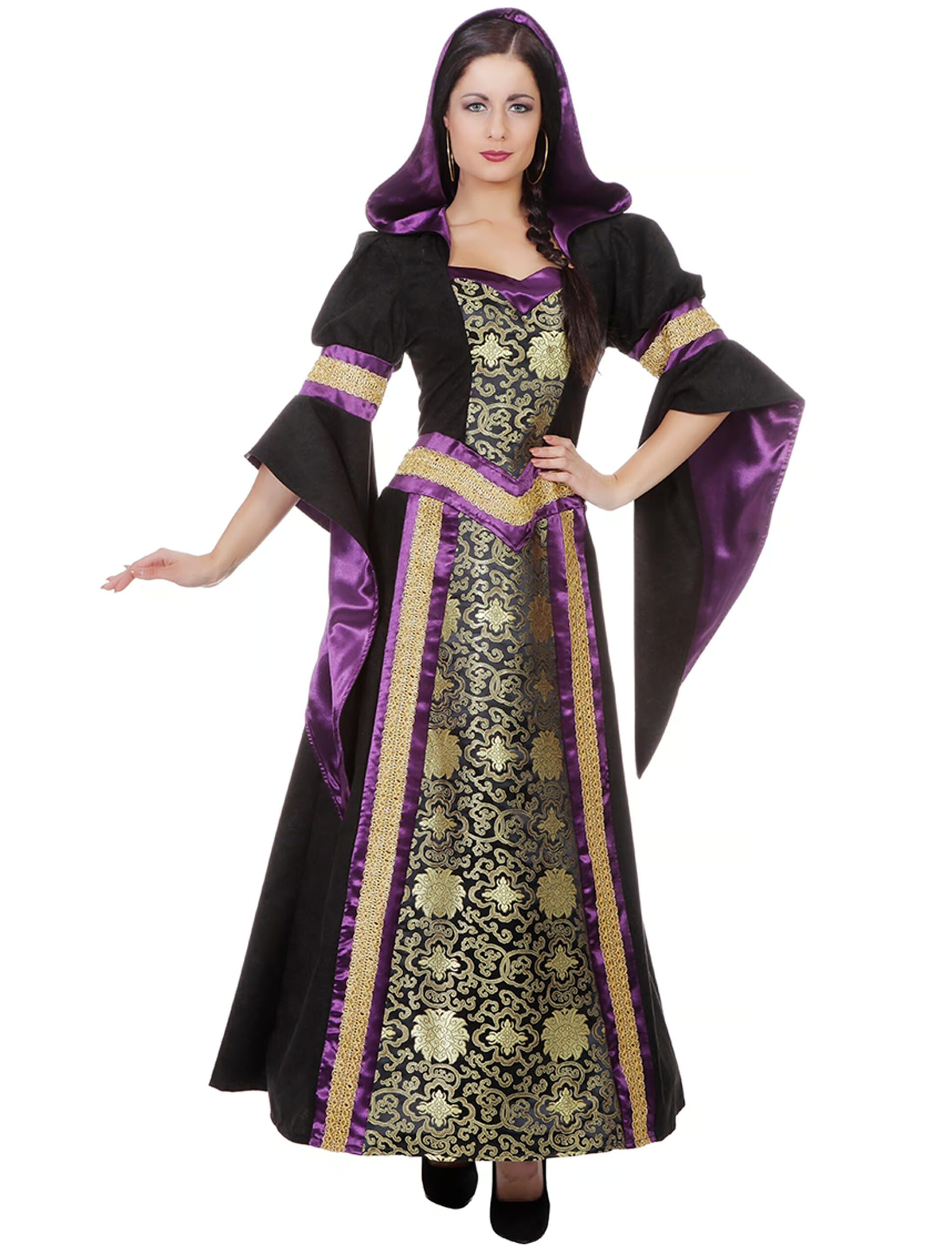 Als hübsche Gothic-Lady weißt Du, wie man Halloweenpartys richtig feiert! Dies beginnt schon damit, dass Du Dein bestes Kostüm trägst. Dein absolutes Lieblingskleid reicht bis zum Knöchel und besteht aus schwarzem Stoff, der in der Front und an den Ärmeln mit goldfarbenen Borten und lilafarbenen Stoff verziert ist. Hingucker ist der mittig eingearbeitete Stoff, der von edlen, goldfarbenen Mustern geziert wird. Die schwarze Kapuze mit dem lilafarbenen Innenstoff rundet Deinen mystischen und geheimnisvollen Look als Gothic-Lady gekonnt ab. Das perfekte Kostüm für die Nacht der Nächte!