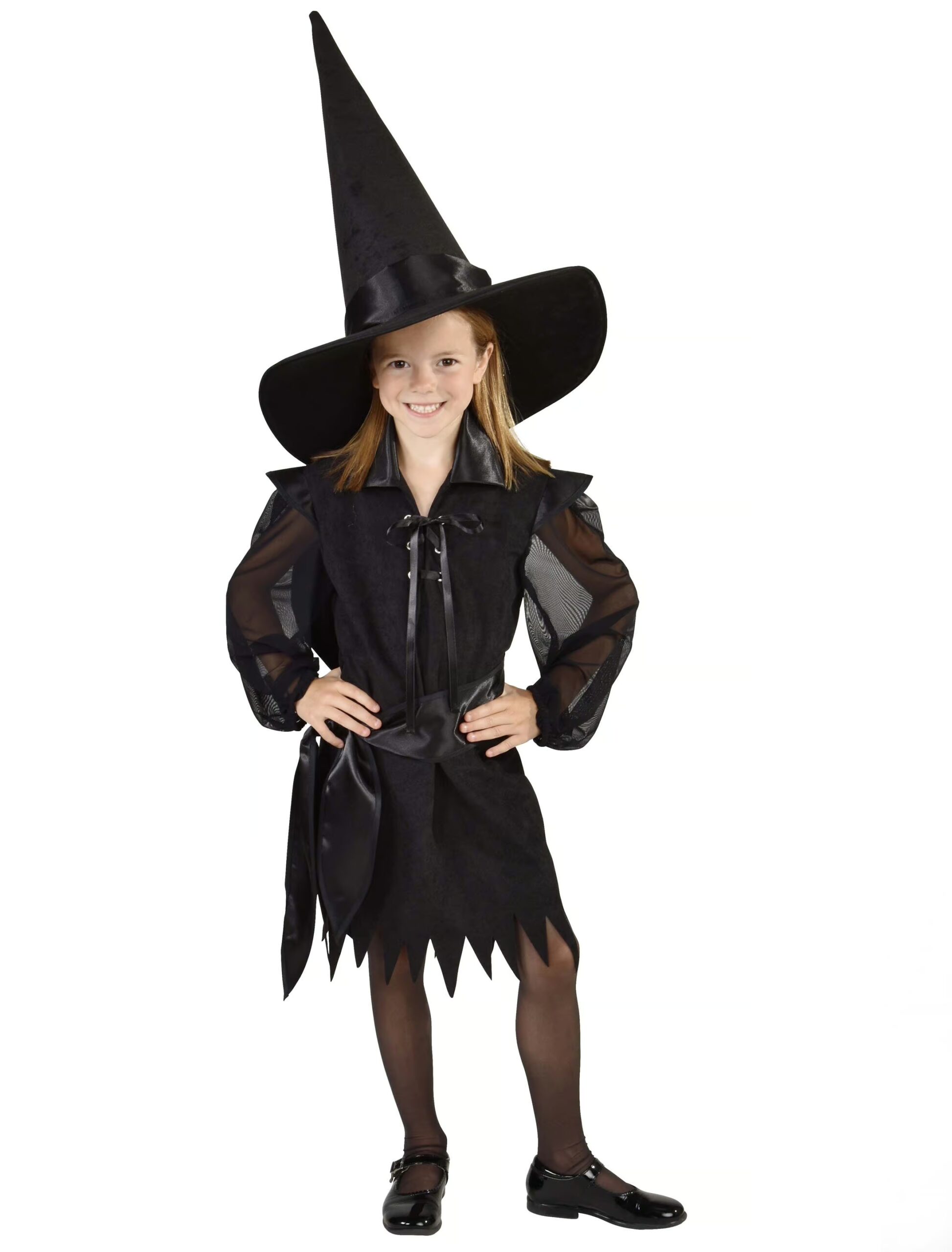 Mit diesem hübschen Hexen-Kostüm tauchst Du perfekt in die dunkle Nacht ein! Das knielange, schwarze Kleid ist am unteren Saum zackig geschnitten und wird in der Front von einer hübschen Schnürung geziert. Der glänzende Gürtel, der auffällige Kragen und die fliegenden und transparenten Ärmel sind weitere Highlights Deiner magischen Halloween-Verkleidung. Jetzt fehlen nur noch Hut und Besen und schon verwandelst Du Dich in eine süße Hexe! Mit Hilfe von Gesichtsschminke rundest Du Dein Kostüm noch zusätzlich ab!