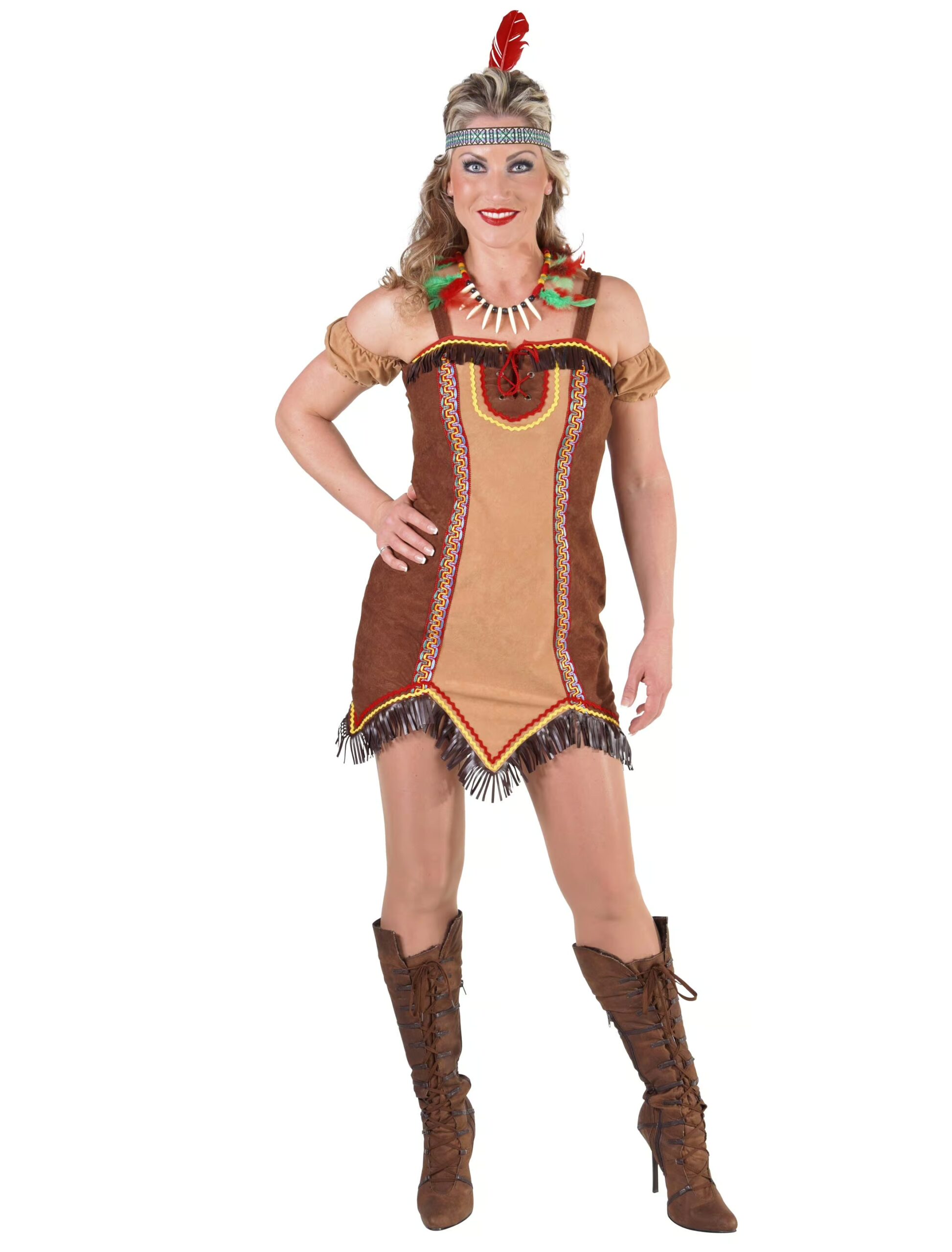Das kurze Kleid ist mit vielen bunten Details (Fransen, Muster) im charakteristischen Indianer-Look verziert, die es zu einem aufregenden Hingucker machen. Die Schnürung in der Front, die doppelten Trägerchen und der asymmetrische Schnitt sind weitere Highlights des Kostüms. Mit Schmuck, Stiefeln, einem Haarband und bunter Schminke verleihst Du Deinem Kostüm eine unverwechselbare Note!