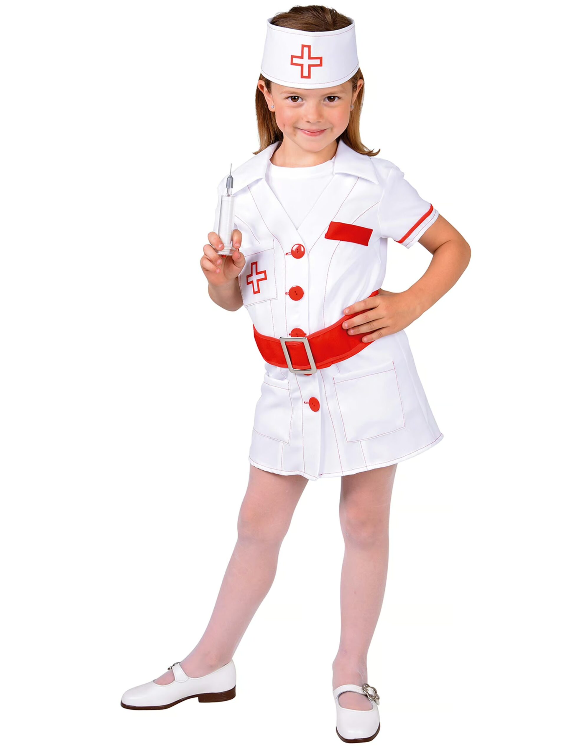 Dein Traum ist es, einmal Krankenschwester zu werden, wenn Du groß bist? In diesem süßen Krankenschwester Kostüm für Kinder kannst Du Deinem großen Wunsch auf der nächsten Karnevalsparty nachgehen. Das Kinderkostüm besteht aus einem knielangen Kleid (ohne dem Gürtel) und halblangen Ärmeln. An den Ärmelenden ist es mit roten Nähten verziert. Abgerundet wird die tolle Verkleidung durch eine weiße Haube mit rotem Kreuz. Das Kostüm besteht aus 100% Polyester.