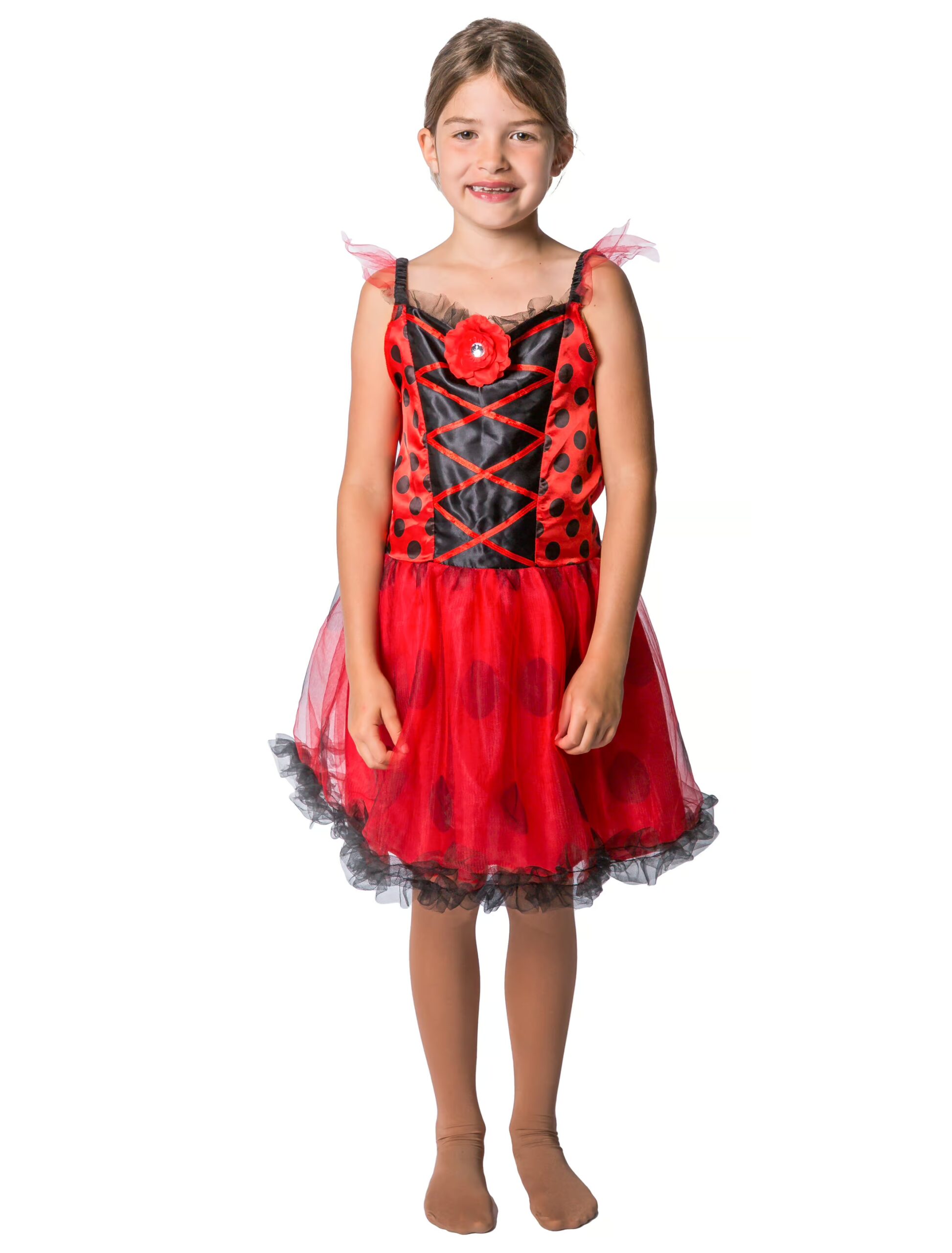 Ihr seid auf der Suche nach einem schönen Marienkäfer Kostüm für Eure Tochter? Dann ist dieses Marienkäfer Kleid für Kinder genau das Richtige. Das Kleid ist mit einem Tüllrock ausgestattet und wird in der Front mit einer Blume geschmückt. Die Hinterseite des Kleides ist elastisch. Ein schönes Kostüm für Karneval und Fasching. Das Kleid ist aus 100% Polyester gefertigt. Fehlen nur noch ein Paar Flügel und ein Marienkäfer Set.