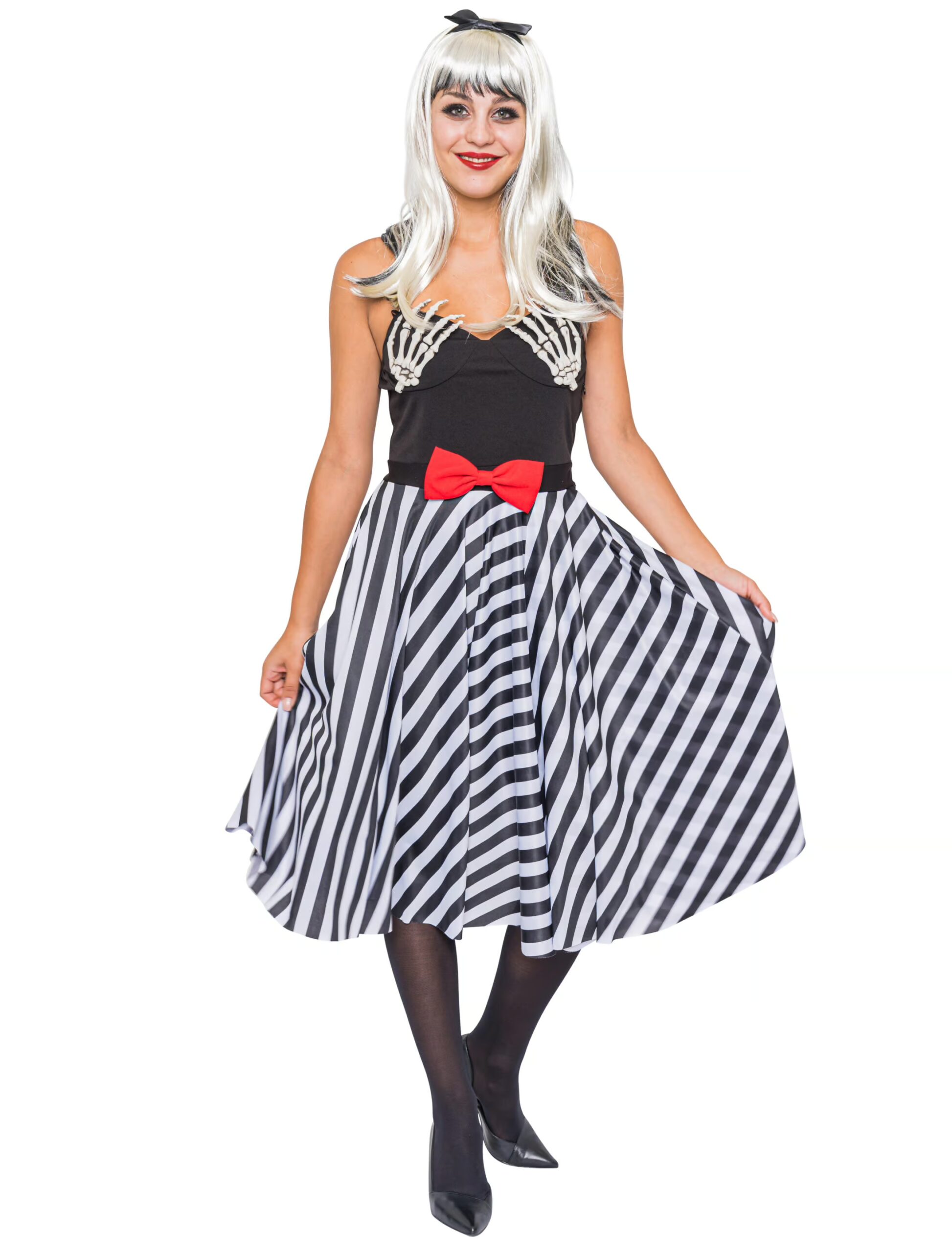 Sehr apart ist dieses charmante, schwarz-weiße, wadenlange Kleid mit den Skeletthänden im Brustbereich, das Deine Figur betont und Dich zum anziehenden Blickfang werden lässt, dem die Herren der Schöpfung bewundernd hinterher schauen. Das Kleid mit dem weiten, diagonal gestreiften, schwarz-weißen Rock und dem schwarzen Oberteil mit den transparenten Trägern, der auffälligen roten Schleife und den hageren Skeletthänden im Brustbereich besteht aus einem Polyester-Elasthan-Gemisch und wird auf der linken Seite mit einem Reißverschluss geschlossen. Kombiniere es mit schicken Accessoires aus unserem Shop und werde zur perfekt gestylten Horrorbraut oder Halloween-Lady, die die Aufmerksamkeit der Männer zu Halloween und zum Fasching genießt.