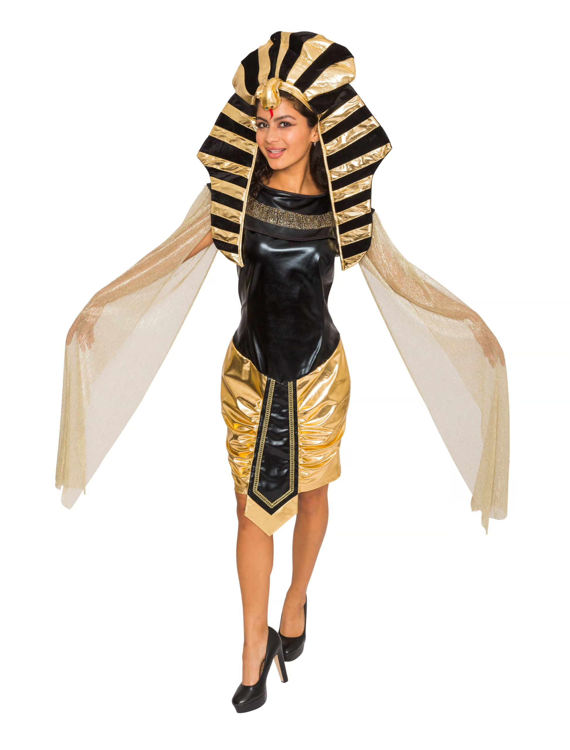 Als ägyptische Göttin Hathor kannst Du Dich an Fasching mit unserem schicken Kleid in Szene setzen. Hathor steht in der ägyptischen Mythologie als weibliche Gottheit für Liebe, Frieden, Schönheit, aber auch musische Bereiche wie Kunst und Musik. Wenn Du Dich mit diesen Eigenschaften identifizieren kannst, dann ist das Kleid genau das richtige Kostüm für Dich. Als ägyptische Göttin verkleidet, bietet Dir das Dress in Schwarz und Gold ein nobles Erscheinungsbild. Dazu kannst Du einen prächtigen Kopfschmuck tragen, den Du ebenfalls bei uns im Shop ergattern kannst. Das Kleid besitzt einen Reißverschluss am Rücken.