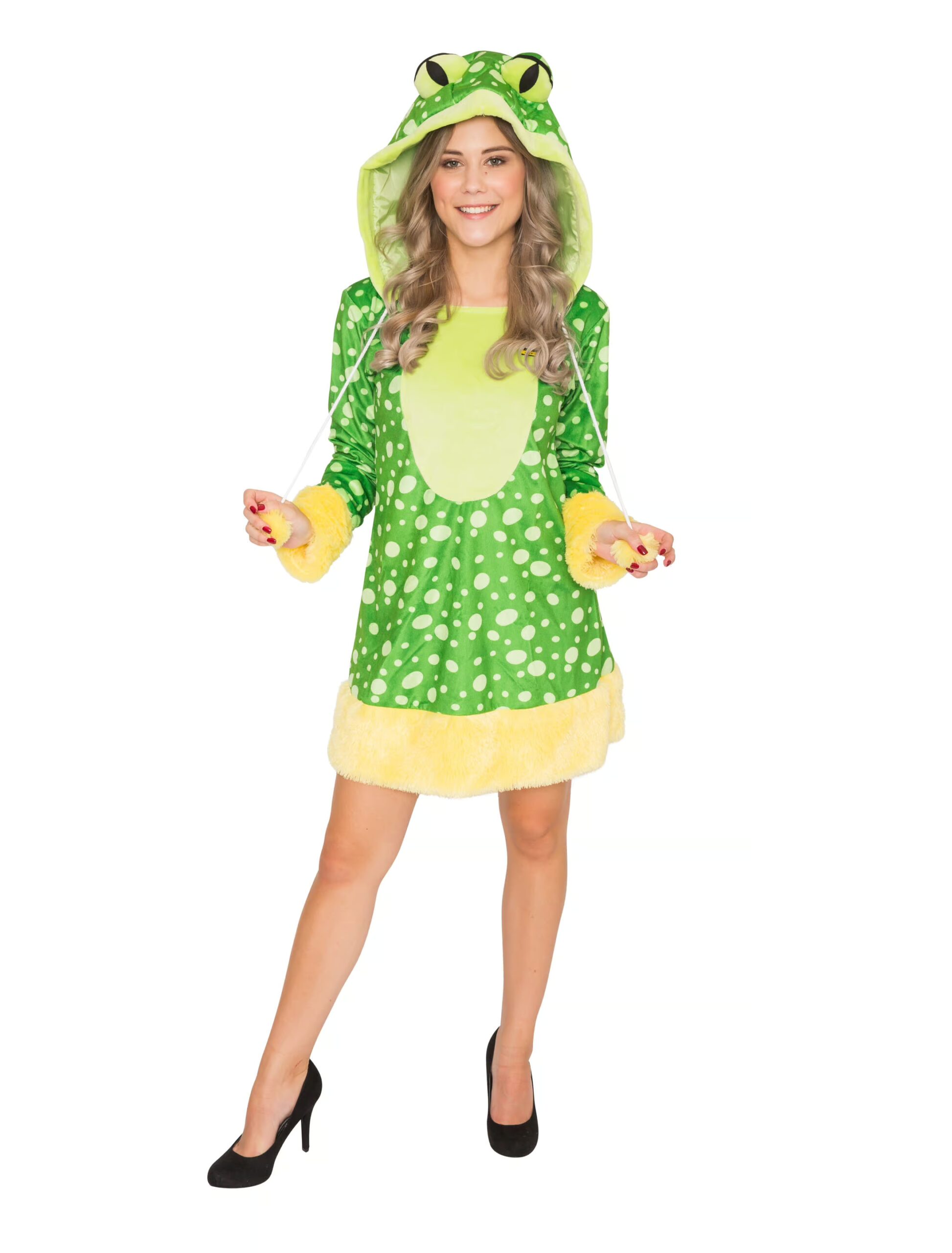 Bring ein bisschen Märchenstimmung auf der nächste Kostümparty! Bei diesem Kleid denkt man einfach direkt an den Froschkönig. Da darf dieses Plüsch Damen Kleid nicht fehlen. Das Kleid ist mit einer Kordelzugkapuze & Bommeln ausgestattet, das mit großen Froschaugen bestückt ist. Ein fester Innenstoff ist dort eingearbeitet. Ein weicher, gelber Plüschstoff befindet sich an den Ärmelenden sowie am Kleidersaum. Das Kleid besteht aus 100% Polyester. Fehlt nur noch die richtige Schminke und schon kann es auf der nächsten Karnevals- oder Mottoparty losgehen!