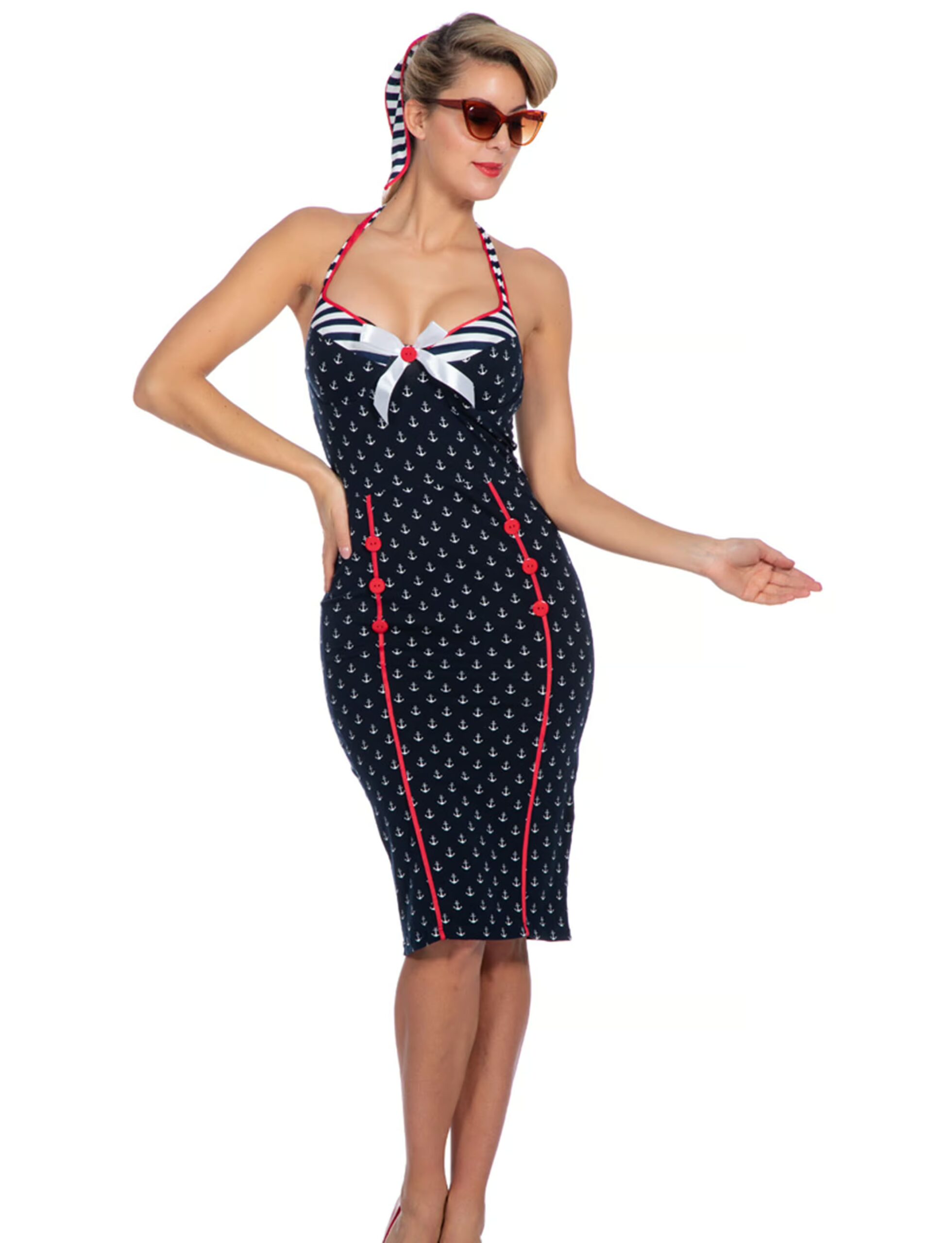 Mit unserem Rockabilly Damen Set bestehend aus einem Kleid mit Anker-Muster und einem passenden Haarband wirst du zur echten Retro-Queen! Ob du in den Hafen der Liebe tanzt oder die Tanzfläche rockst – dieses Outfit sorgt dafür, dass alle Augen auf dich gerichtet sind. Das Kleid ist ein absoluter Hingucker: Mit seinem charmanten Anker-Muster und dem klassischen Rockabilly-Look bringt es maritimen Flair und 50er-Jahre-Stil zusammen. Kombiniere das Set mit roten Lippen, hohen Schuhen und einem frechen Augenaufschlag – und fertig ist dein Look, der jedes Hafenlicht erblassen lässt. Retro, chic und einfach unwiderstehlich – dein Ticket in die goldenen Zeiten des Rockabilly!