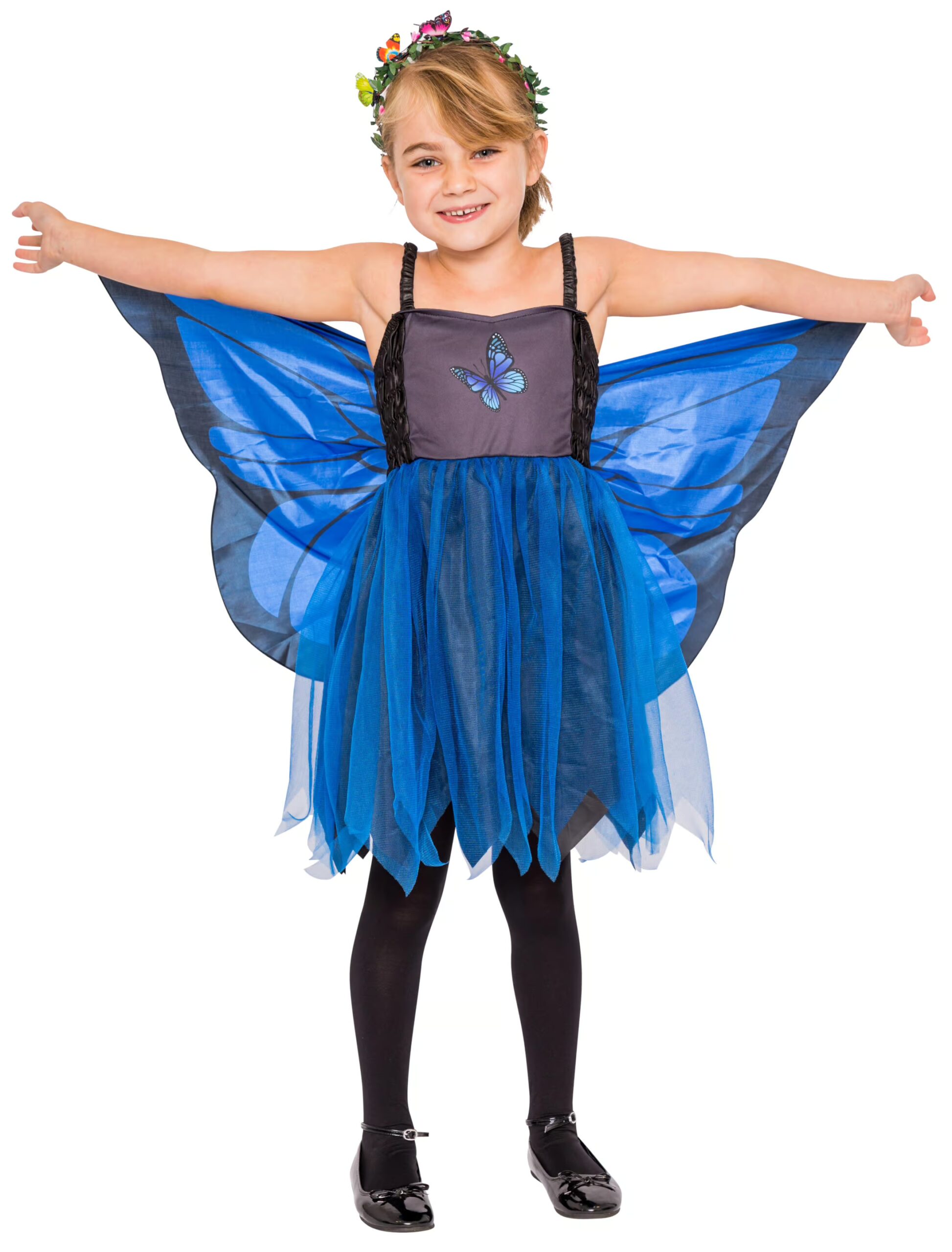 Alle Kinder lieben die niedlichen und bunten Schmetterlinge, die sich scheinbar schwerelos im Sonnenschein tummeln. Und so manches kleine Mädchen möchte auch einmal ein so bezaubernder Falter sein und auf dem Sommerfest oder dem Kindergeburtstag mit seinen Freundinnen auf einer bunten Blumenwiese tanzen. Mit diesem zauberhaften Schmetterlingskleidchen in Blau samt den bedruckten Flügelchen wird aus Deinem kleinen Schatz der allerliebste Schmetterling unter der Sonne. Das leichte Trägerkleidchen mit schwarzem Oberteil und buntem Schmetterling, blauem Tüllrock und den schönen SchmetterlingsFlügeln ist ein besonders wirkungsvolles Kinderkostüm, das Dein Kind immer wieder gern und mit Stolz tragen wird.