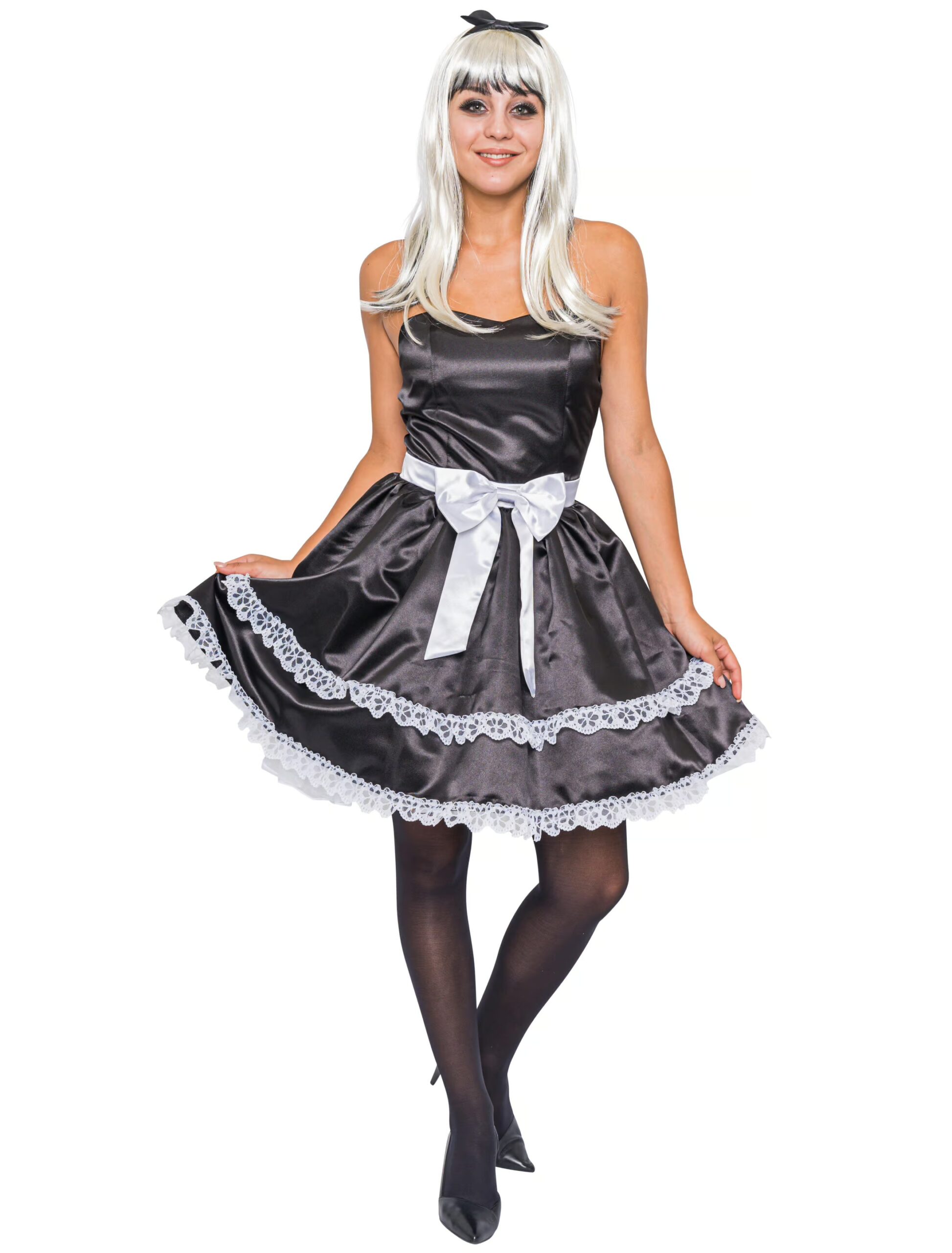 Super schick und verführerisch ist das kurze und freizügige Serviererinnenkleid aus seidig glänzendem Polyesterstoff, das nicht nur der absolute Hingucker auf Motto-Partys und Kostümfesten ist, sondern auch die Fantasie der närrischen Männerwelt auf besondere Weise beFlügelt. In diesem figurbetonenden, schwarz-weißen Kleid kommen nicht nur Deine Figur, sondern auch Deine langen Beine und Dein hübsches Dekolletee wunderschön zur Geltung. Das, mit transparenten Trägern, ausgestattete Kleid wird per Reißverschluss am Rücken geschlossen und besteht aus einem schwingenden Rock mit hübschem, weißen Spitzenbesatz im Saumbereich, einem knappen Oberteil sowie der großen weißen Schleife, die das kokette Dienstmädchen Kleid komplettiert. Mit einem süßen Haarschmuck und High Heels aus unserem Shop bist Du die Verführung in Person.