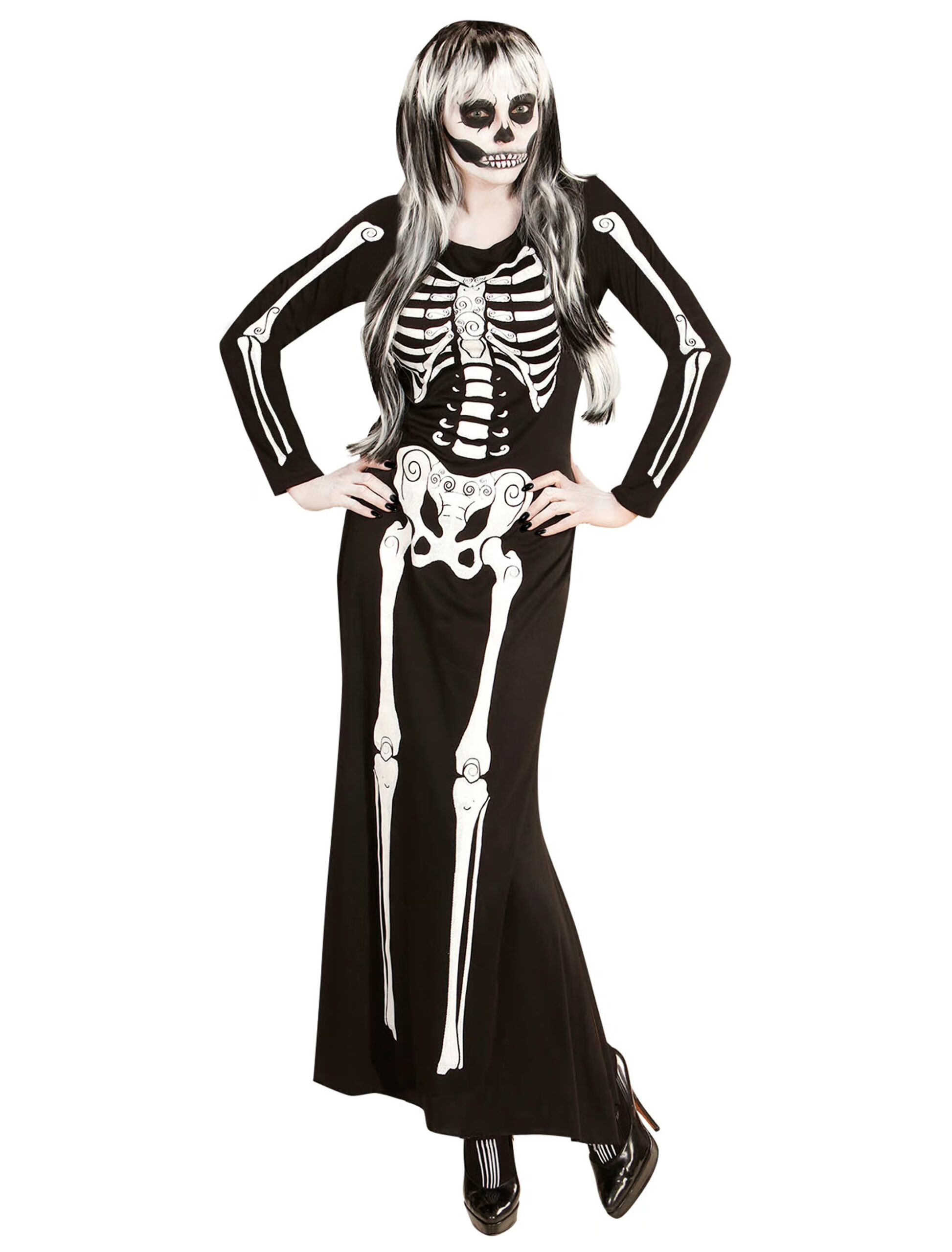 Schaurig-schönes Kleid für Deine nächste Halloween- oder Gruselmottoparty oder für den berühmten Dia de los Muertos (Tag der Toten, Day of Death). Das Skelett Kleid besteht aus einem schwarzen, knöchellangen Stoff, der in der Front mit jeweils den richtigen Knochen an den richtigen Körperstellen verziert ist. Die lange Kostümierung ist die ideale Komplettlösung, die Du nach Belieben mit schwarz-weißer Gesichtsschminke, dunkler Haarfarbe und weißen Strähnchen abrunden kannst!