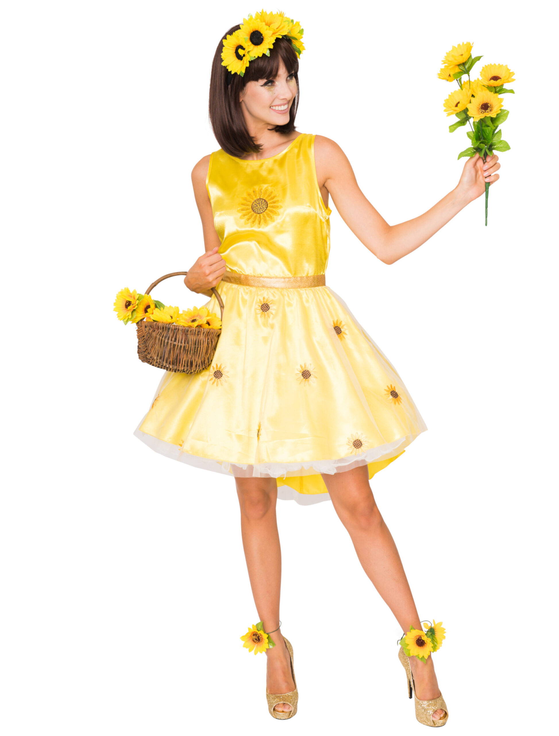 Ein wahres Highlight ist das seidig glänzende, gelbe Sonnenblumenkleid aus Polyester, mit dem Du Licht und Wärme in die düstere Faschingszeit bringst. In diesem wundervollen, ärmellosen Kleid mit dem weit ausgestellten, sich nach hinten verlängerndem Rock, dem eingefassten goldenen Band und den prachtvollen Sonnenblumendesign bist Du, ein entzückender Eyecatcher, der sowohl bewundert als auch beneidet wird. Als wunderbares Blumenmädchen oder liebreizende Blumenfee verzauberst Du die Gäste von Motto-Partys sowie Kostümfesten und hinterlässt einen charmanten, bleibenden Eindruck. Passende Haarreifen, Dekoblumen sowie alles für Deinen perfekten Auftritt findest Du in unserem Shop.