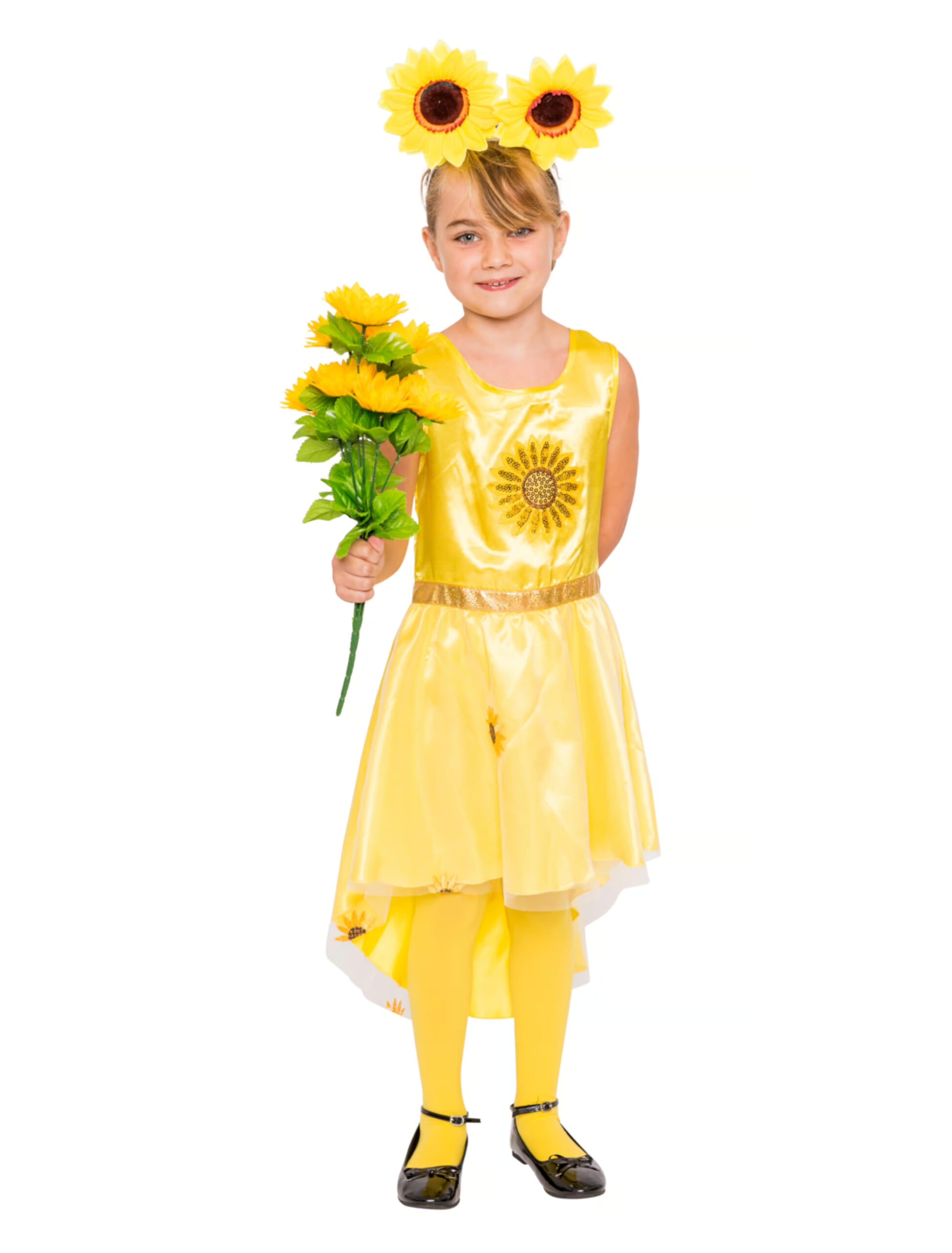 Super süß ist dieses herrliche, golden glänzende Sonnenblumenkleid für Kinder, mit dem Dein Kleiner Schatz fast schöner als die liebe Sonne leuchtet und mit seiner sonnigen Ausstrahlung auf dem Kindergeburtstag, zum Kinderfasching oder der Sommerparty Freude bereitet. In diesem bezaubernden, ärmellosen Kostümkleid mit dem weiten, asymmetrischen Rock, dem goldenen Gürtel sowie dem charmanten Sonnenblumendesign ist Deine Kleine ein lieblicher Eyecatcher, der die Blicke auf sich zieht und der von seinen Freundinnen um das hübsche Kleid beneidet wird. Komplettiert mit einem Sonnenblumenhaarreif und den passenden Accessoires aus unserem Shop erlebt Deine kleine Sonnenblume eine unvergessliche Faschingszeit.