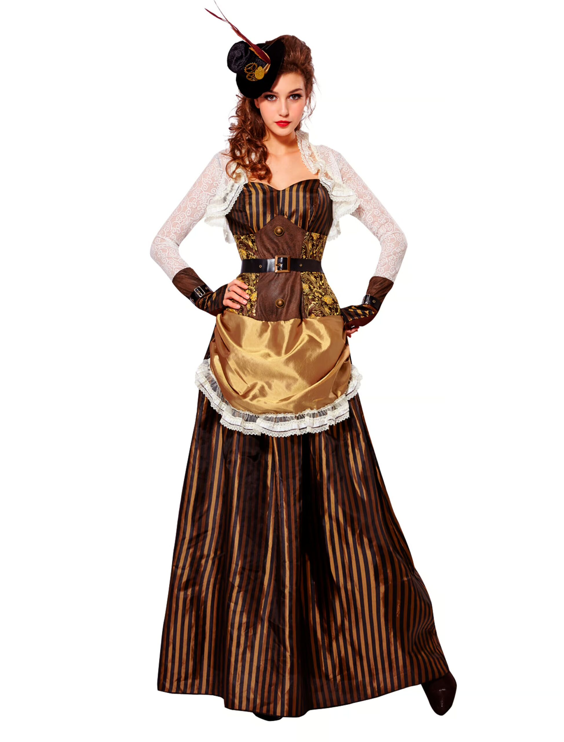 Tauche ein, in eine Welt, die nicht spannender und widersprüchlicher sein könnte, als die des Steampunks! Dieses wunderschöne Kleid macht Dir das Eintauchen in diese aufregende Welt besonders leicht: Das pompöse, lange, braune Kleid mit den schwarzen Streifen ist mit vielen Details wie einem Gürtel, Knöpfen und einem helleren Stoff mit weißer Spitze in der Front verziert. Hingucker ist auch die weiße, angenähte Bolero Jacke mit Spitze und den dunkel abgesetzten Ärmeln, die aussehen wie Handschuhe. Dazu gehört ein kleiner Hut mit Federn und Zahnrädern, der Deinen viktorianischen Look gekonnt abrundet!